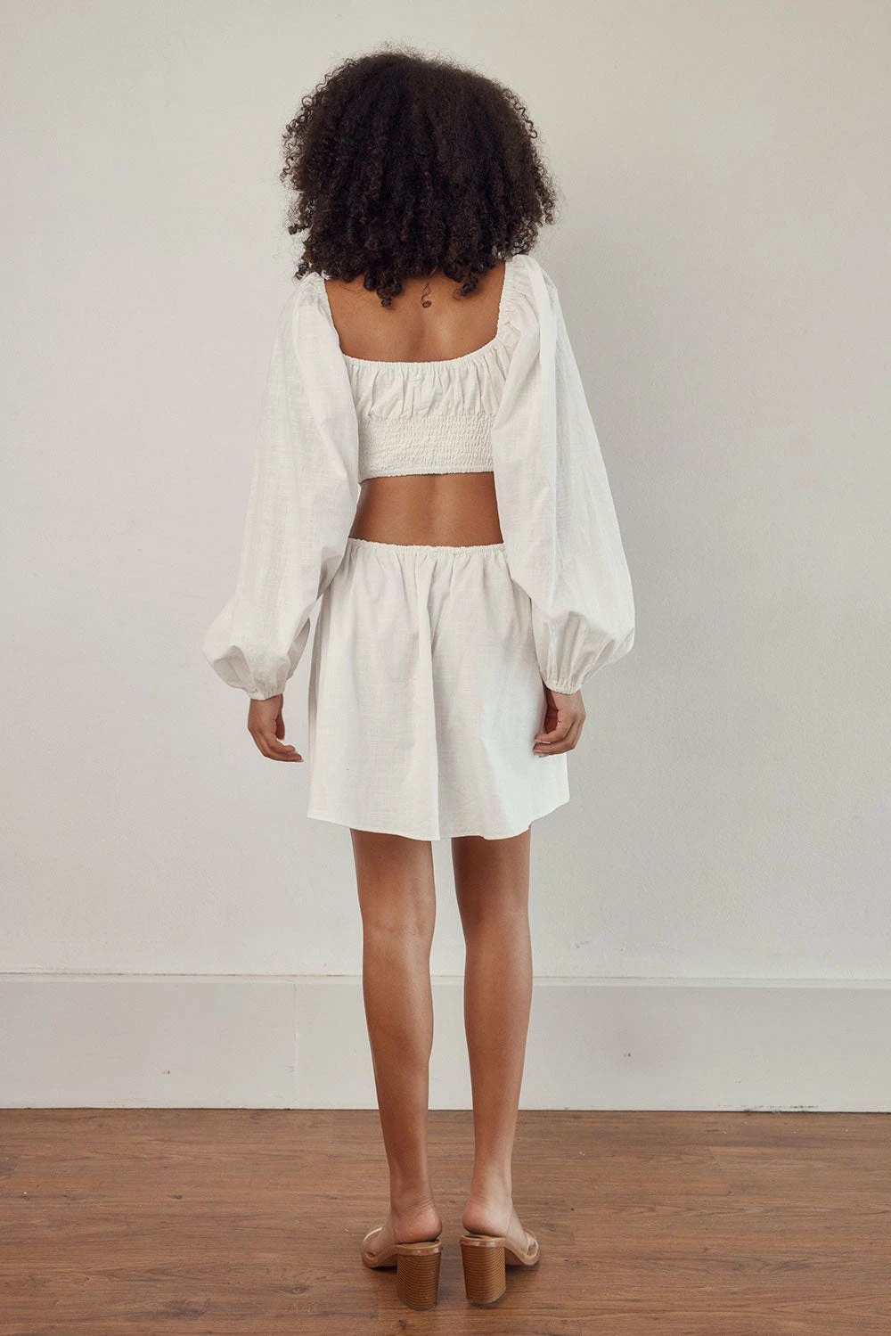 Dress it up with heels for date night or pair it back with slides! The Harvie Shirred Dress is made from a high quality natural cotton slub fabric in white. It features full length puff sleeves, elasticated neckline, shirred panel and cutout details at waist, buttons down centre front and a flouncy skirt. Style with the Petal Necklace and Strappy Asteria Heels! Designed exclusively by Sabo.