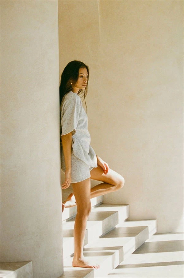 *THIS IS A FINAL SALE ITEM* A basic shape made from the cosiest fabric! The Huston Top is made from a soft light grey knit fabric with a dark speckle throughout. It is an oversized style featuring a rounded neckline, drop shoulders and short sleeves. Get the set and pair with the Huston Shorts! Designed exclusively by Sabo.