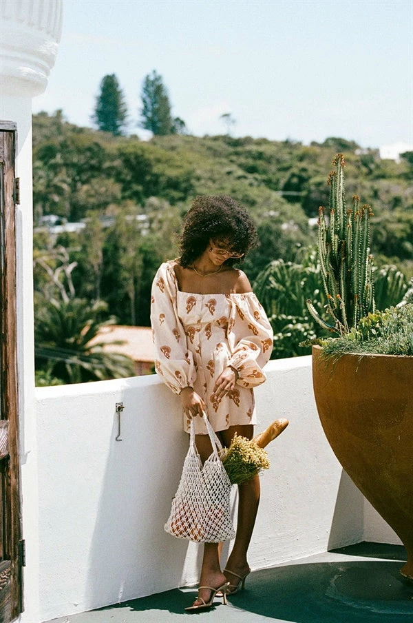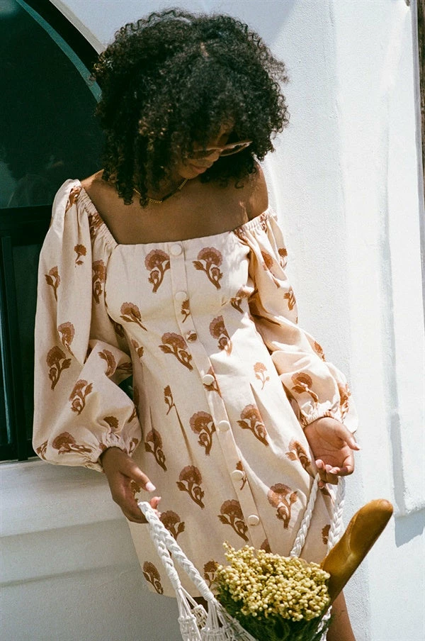 The ultra flattering Tyla Dress is made from a natural linen cotton blend fabric with our exclusive antique emblem print. It features a square neckline, full length puff sleeves, covered buttons down centre front and flattering fitted waist. Complete the look with the Nahla Ruched Bag! Designed exclusively by Sabo.