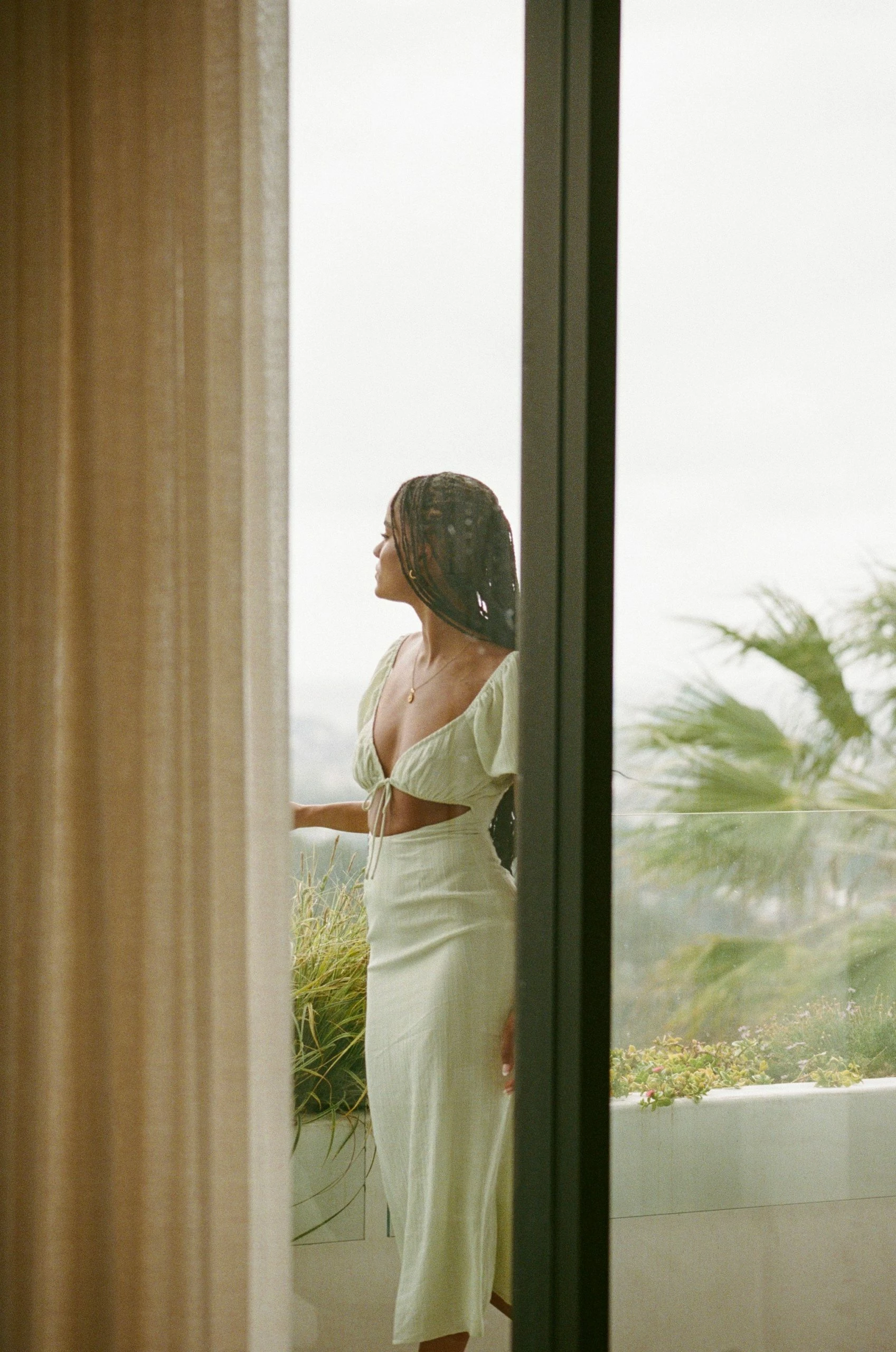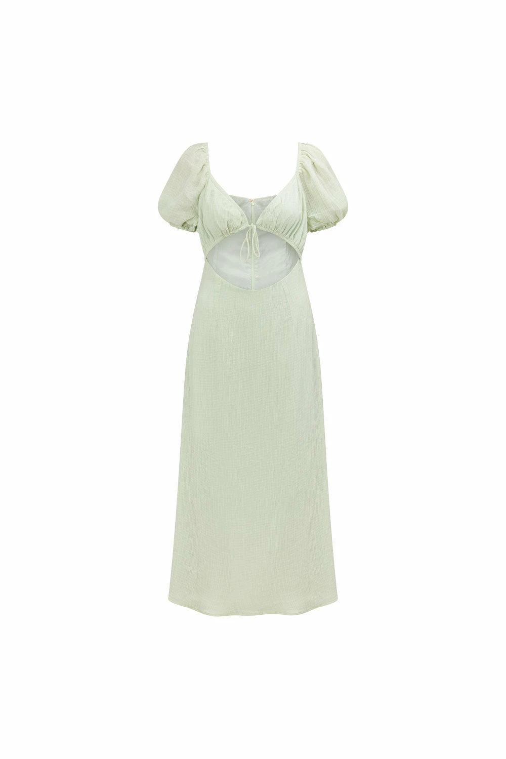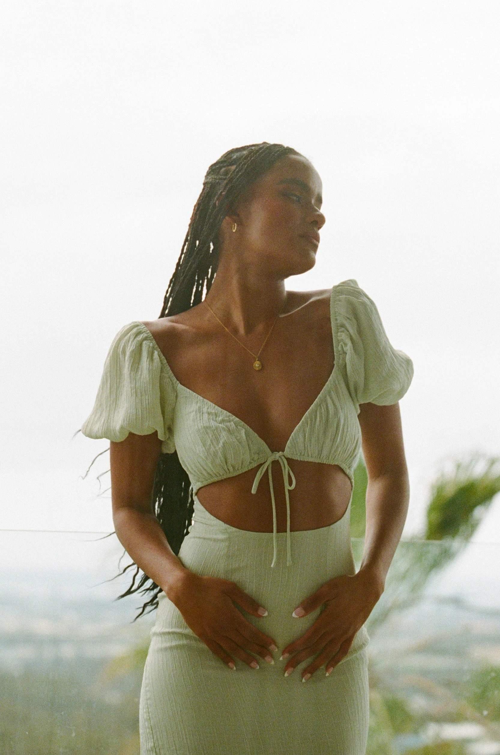 Afternoon event? We’ve got you sorted! The Jacqui Cutout Dress is made from a lightweight textured fabric in a soft green hue. It features short puff sleeves, tie at centre bust, cutout at waist and midi length skirt. Pair with the Zita Strappy Sandals! Designed exclusively by Sabo.