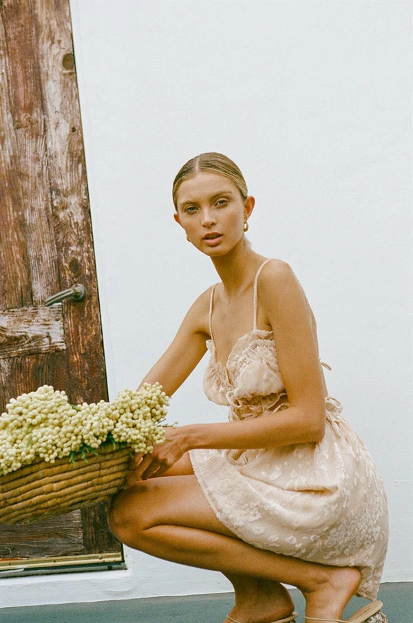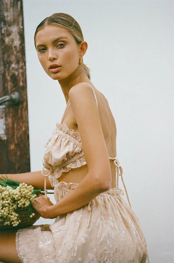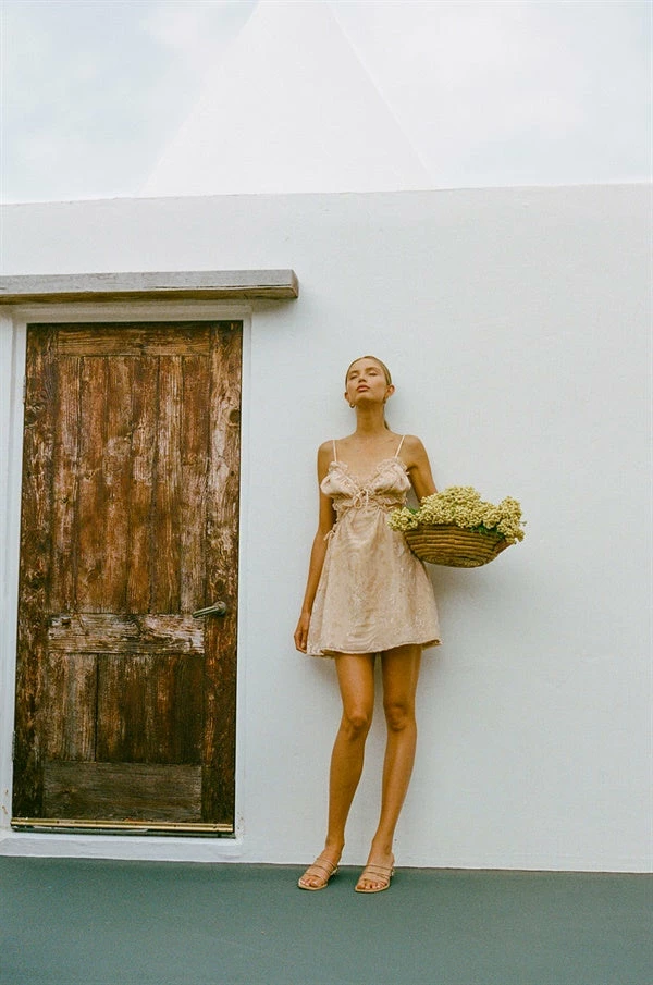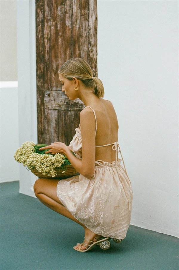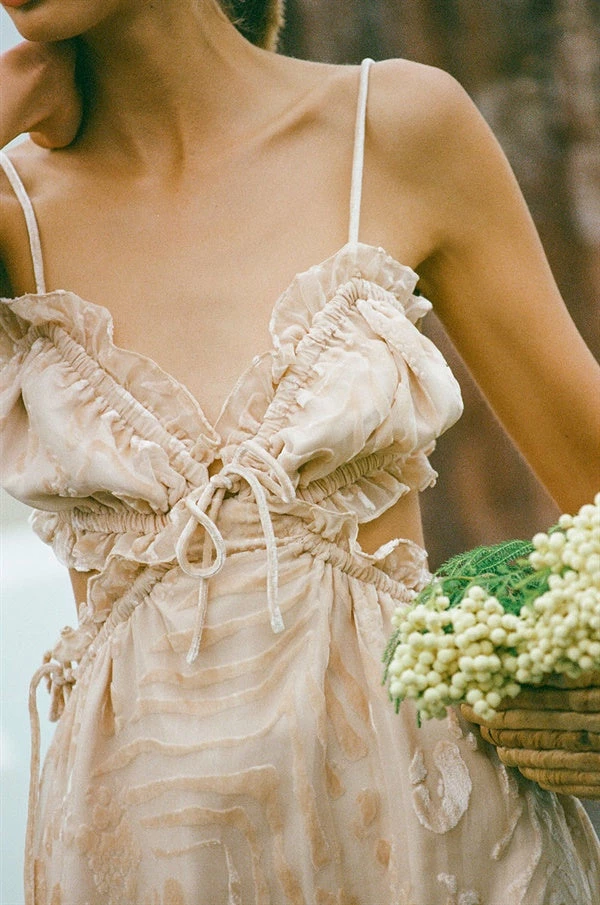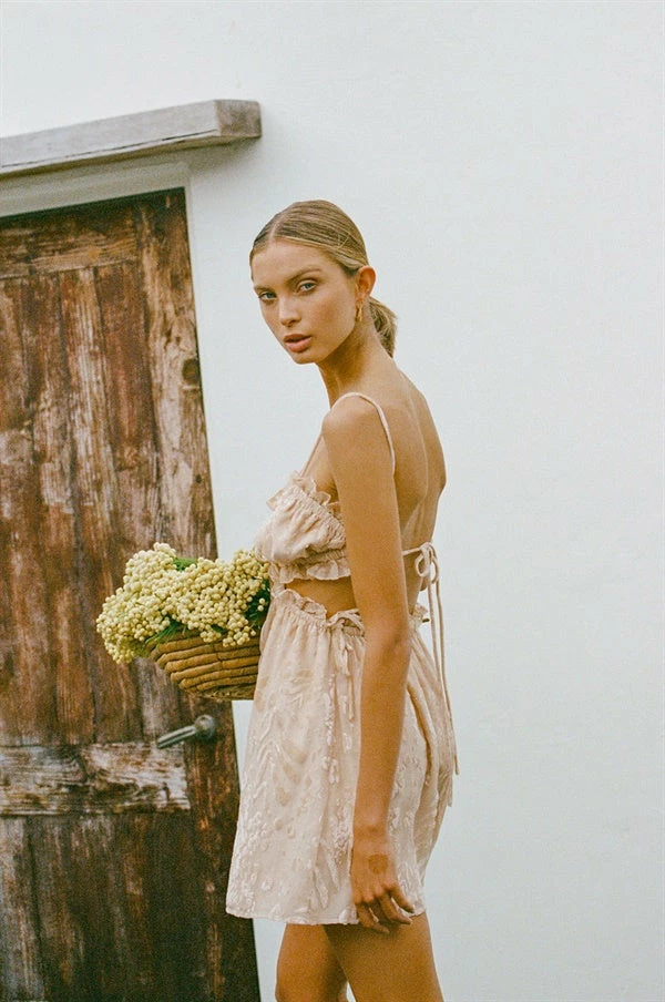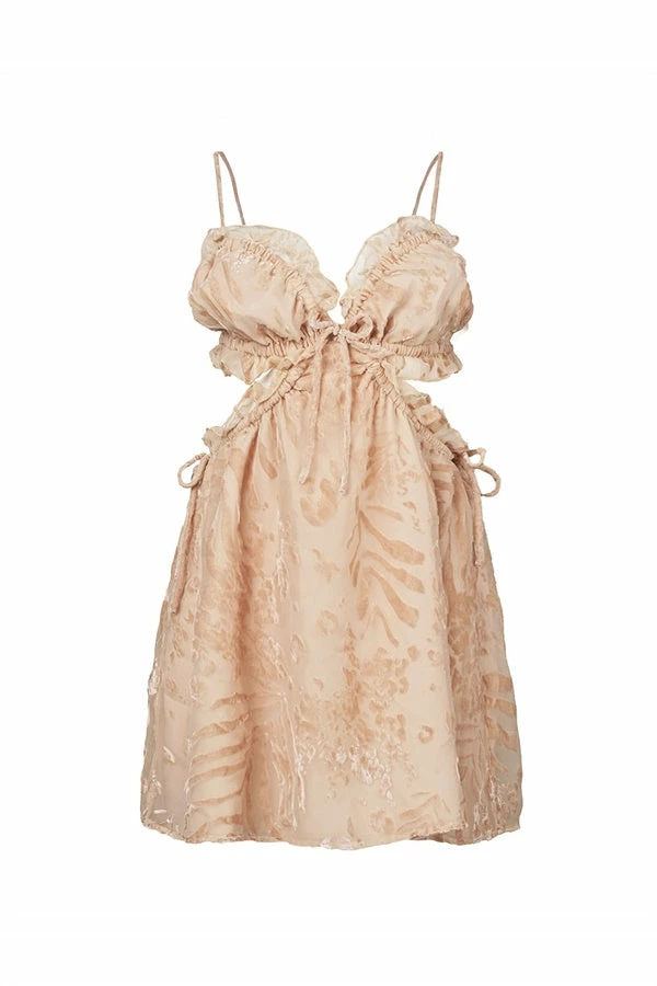 A feminine design in luscious fabric for the fashion lover! The Jadana Cutout Dress is made from our exclusive burnout animal print in a tan hue. It is a backless style featuring gathered elastic cups, cutouts at waist with elastic and tie details and a flouncy skirt. Style your look with the Strappy Ramos Heels! Designed exclusively by Sabo.