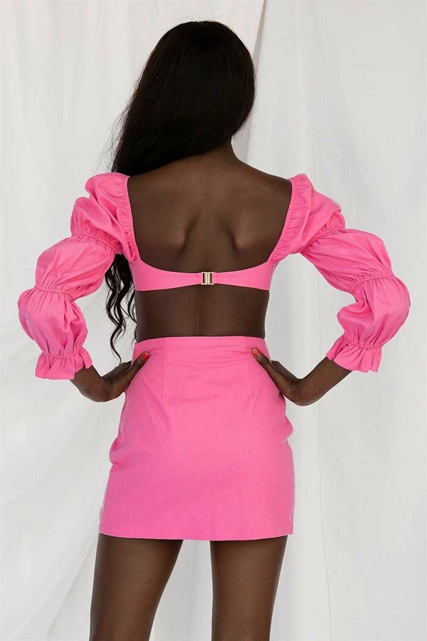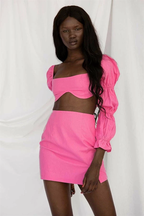 *THIS IS A FINAL SALE ITEM* Add some colour to your wardrobe with the Jade Skirt, made from a natural cotton and linen blend fabric in a vibrant pink hue. It is a high waisted style featuring an off centre split. Get the look with the Jade Top and Iyo Sandals! Exclusively designed by Sabo.