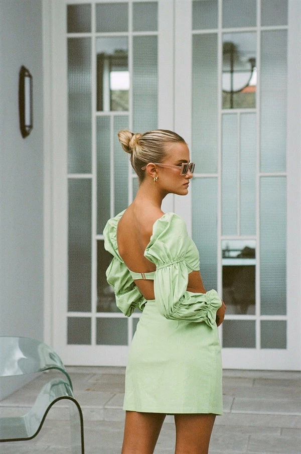 Wear it as a set or pair it with jeans! The Jade Top is made from a natural linen cotton blend fabric in a green hue. It is a bandeau style featuring a straight neckline, contouring curved hem and elasticated puff sleeves. Get the look with the Jade Skirt and Rico Handle Bag! Designed exclusively by Sabo.
