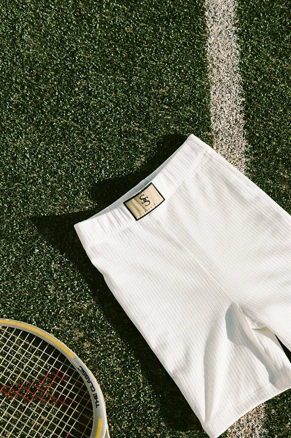 A must-have basic! The Jaelyn Bike Shorts are made from a natural ribbed cotton fabric in an off white hue. They are a fitted high waisted style featuring an elasticated waist with logo patch detailing and are fully lined. Complete the look with the Jaelyn Top and Poetry Top! Exclusively designed by Sabo.