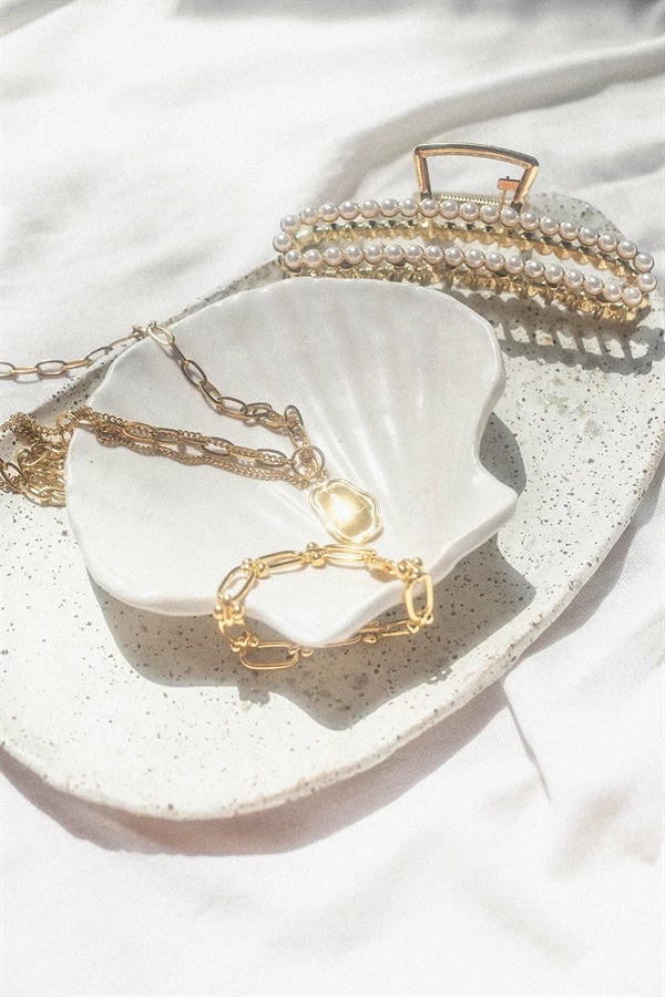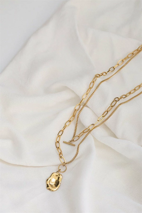 Let us do the layering for you! The Jayda Layered Necklace is gold toned and features thin and link chains with a T bar closure and an odd oval pendant.