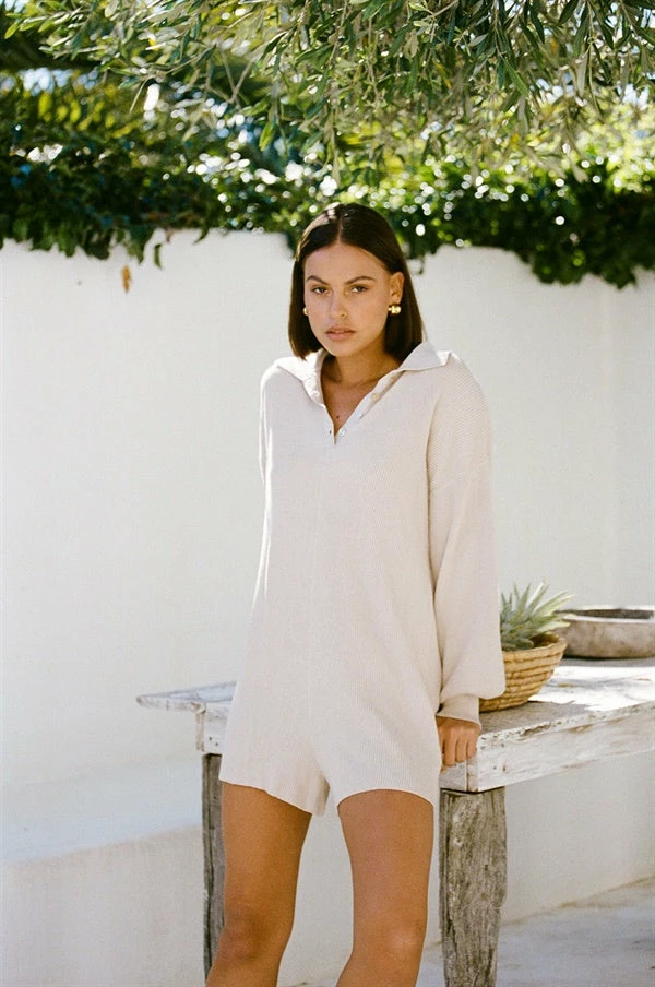 The super cute and transeasonal Jayla Playsuit is made from a knitted ribbed fabric in a tan hue. It features full length puff sleeves with elasticated cuffs, high-low hems, a collar and buttons at centre front of neckline. Pair with the Lattice Mini Backpack and Jersey Scrunchie! Exclusively designed by Sabo Skirt.