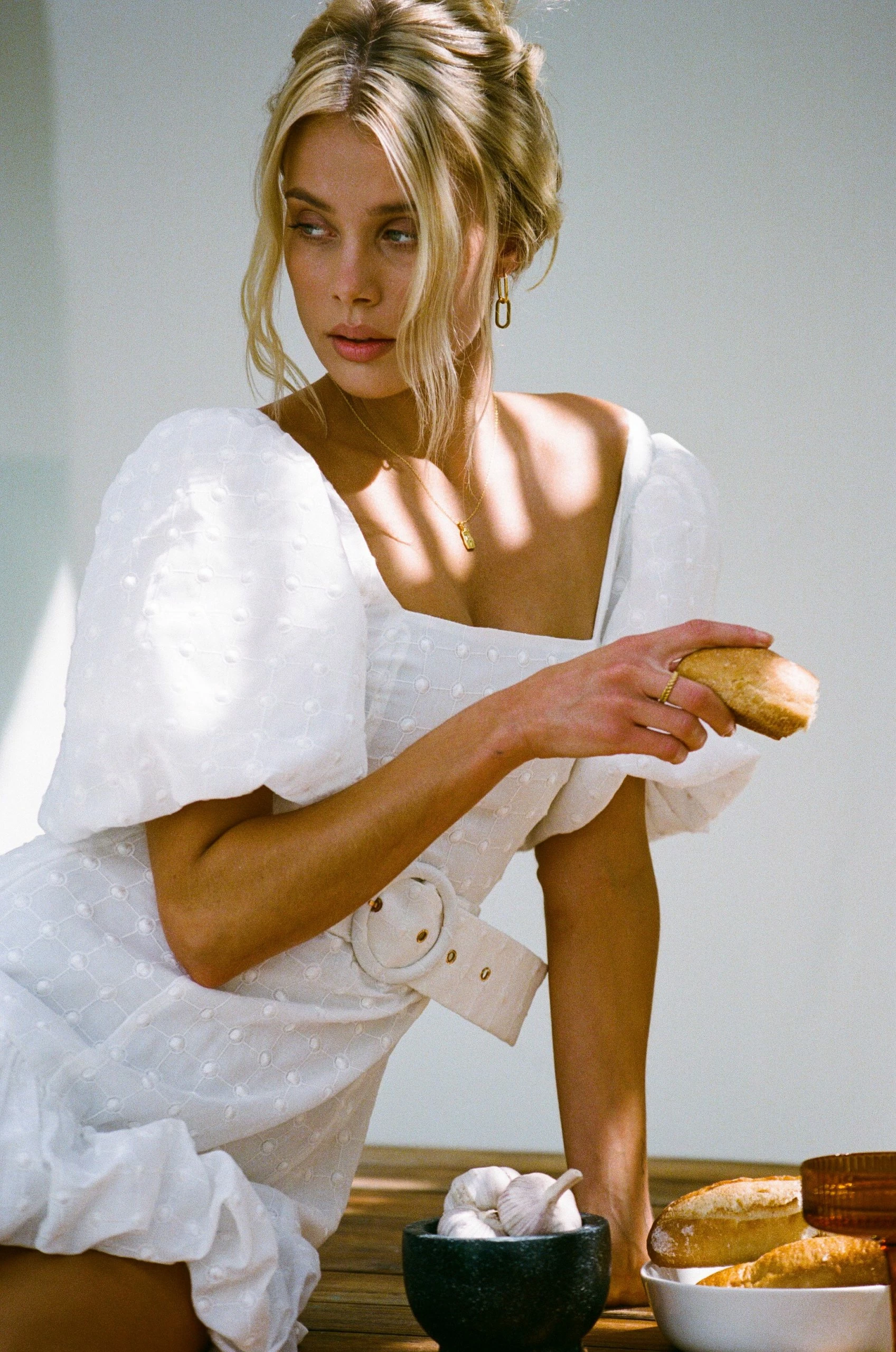 The perfect party dress has arrived! The July Dress is made from a textured embroidered spot voile fabric in white. It features a square neckline, bubble details at sleeves and hem of skirt and a matching belt. Dress it up with the Strappy Rafaela Heels and Jamilla Bag! Designed exclusively by Sabo.