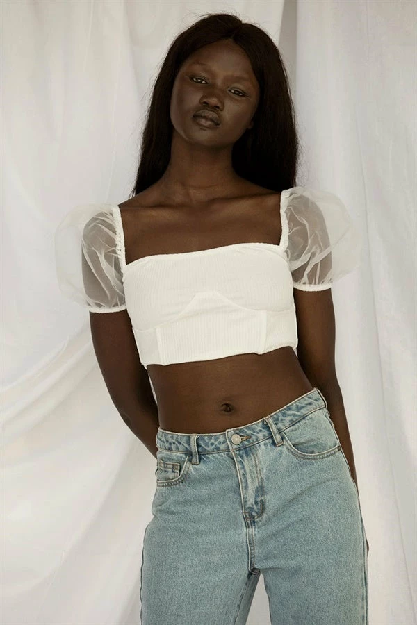 *THIS IS A FINAL SALE ITEM* The perfect pair for your denim! The Jupiter Top is made from a cotton fabric in an off white hue. It features boning at waist and short sheer puff sleeves! Get the look with the high waisted jeans and heels! Exclusively designed by Sabo.