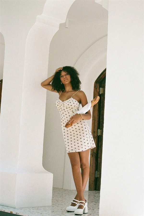 Designed to flatter! The Kahlua Dress is made from a beige cotton blend fabric with a brown floral print throughout. It features thin straps, keyhole cutout and tie at centre bust, gathered cups and a body skimming skirt. . Complete the look with the Glow Necklace and Transparent Mules! Designed exclusively by Sabo.