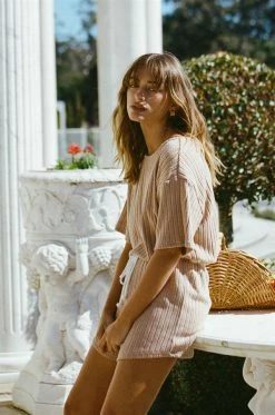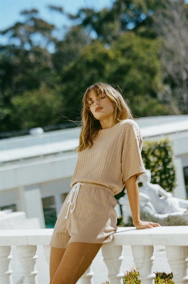 *THIS IS A FINAL SALE ITEM* Your favourite casual style in a super cosy fabric! The Kairo Top is made from a soft tan ribbed fabric with a cable design throughout. It is a relaxed fit featuring a high rounded neckline, short sleeves and a curved hem. Get the set and pair with the Kairo Shorts! Exclusively designed by Sabo.