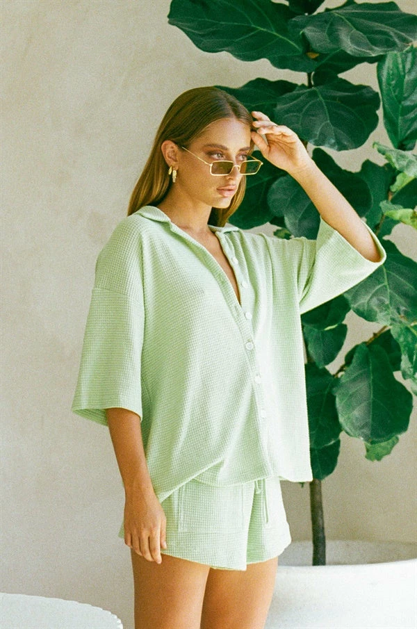 For sunkissed vacation vibes! The Kase Top is made from a soft waffle fabric in a green hue. It is a relaxed style featuring a collar, white buttons down centre front and 1/2 length boxy sleeves. Pair with the Kase Shorts and SBO Market Tote Bag! Designed exclusively by Sabo.