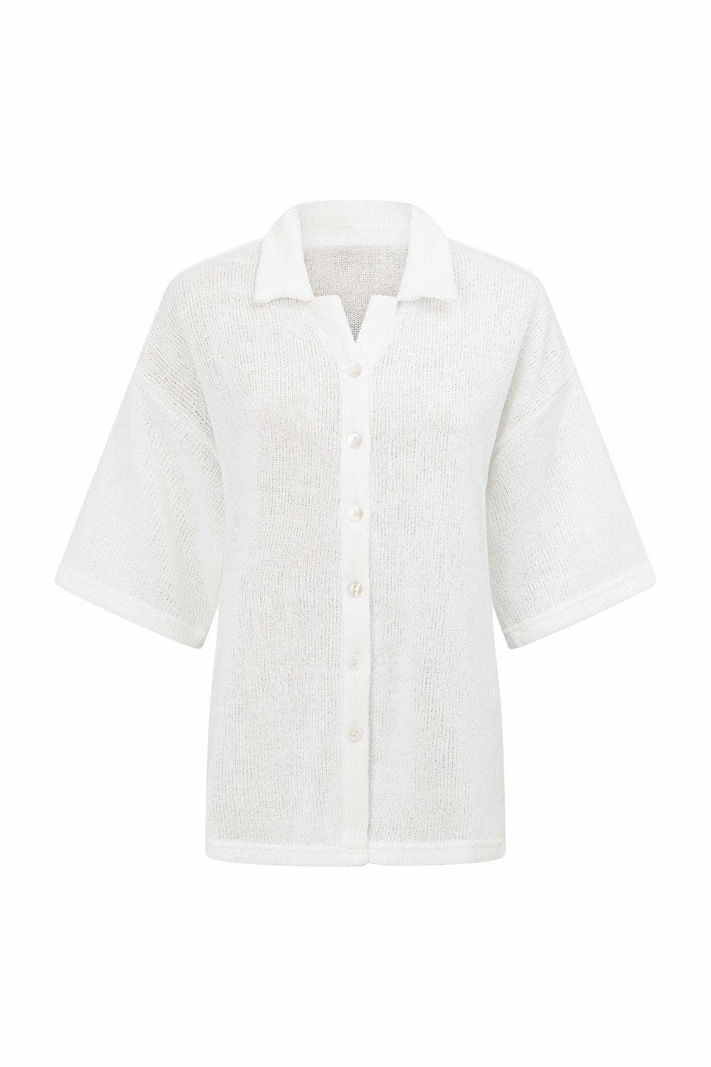 *BACK IN STOCK* For sunkissed vacation vibes! The Kase Top is made from a knitted fabric in a cream hue. It is a relaxed style featuring a collar, buttons down centre front and 1/2 length sleeves. Pair with the Kase Shorts for the perfect beachside look! Exclusively designed by Sabo.