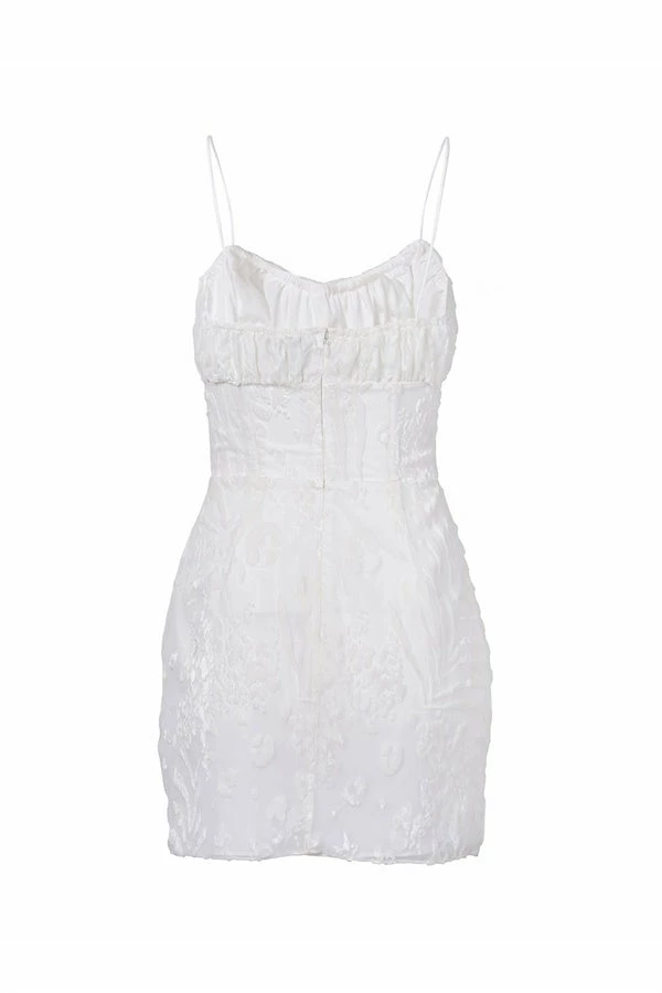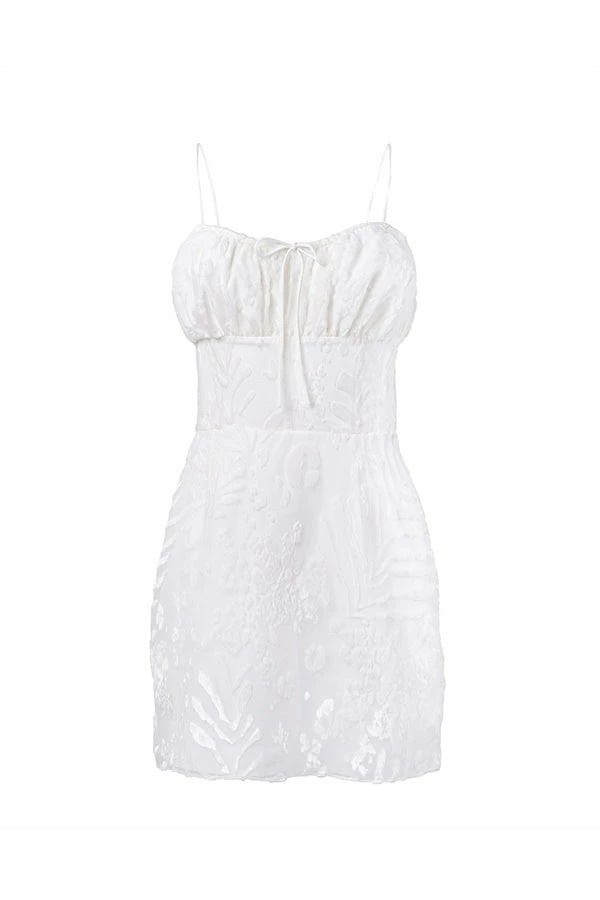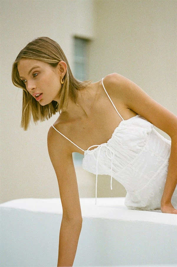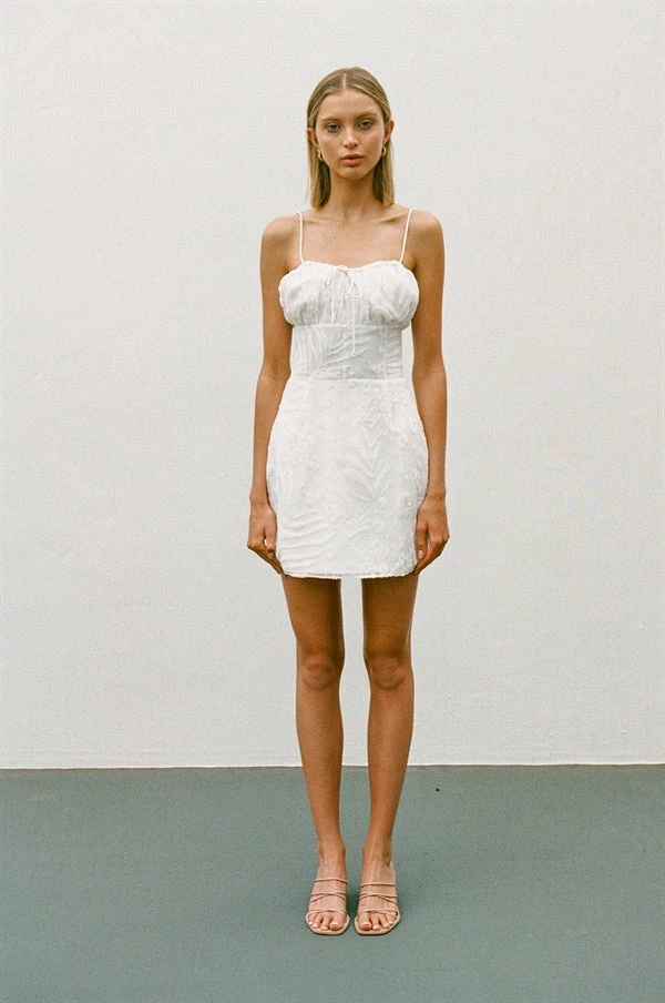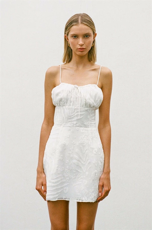 Designed to flatter! The Kayo Cami Dress is made from our exclusive animal burnout fabric in an off white. It features thin straps, drawstring tie at centre neckline and a fitted waist with boning for added structural support. Pair with the Strappy Lilly Heels for your next event! Designed exclusively by Sabo.