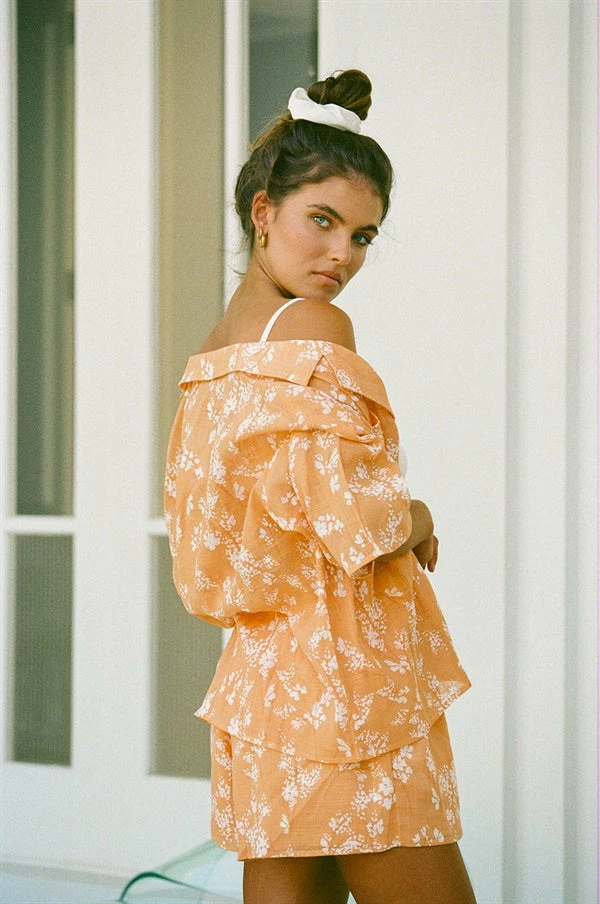 Perfect for a weekend by the sea, the Keira Top is made from an orange cotton cheesecloth fabric with our exclusive speckled floral print. It is a relaxed style featuring a low lapel collar, twin breast pockets, buttons down centre front and 1/2 length sleeves. Get the set with the Keira Shorts and throw over the Honeycomb bikinis! Designed exclusively by Sabo.