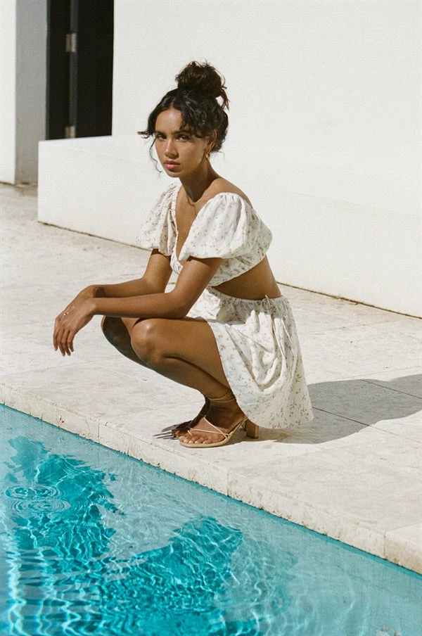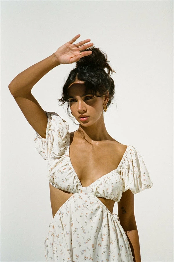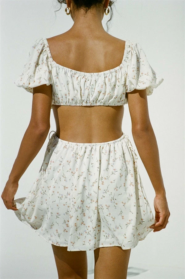 The cult favourite design now in a cute floral print! The Kenny Cutout Dress is made from a lightweight floaty cream fabric with a floral print throughout. It features flattering cutouts at waist, short puff sleeves, a flouncy skirt and tie detailing at sides of waist. Designed exclusively by Sabo.