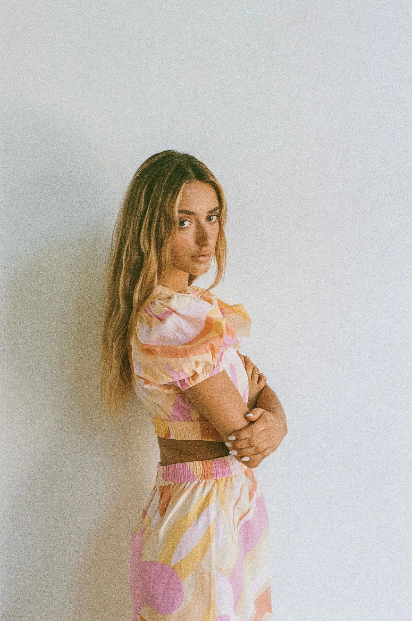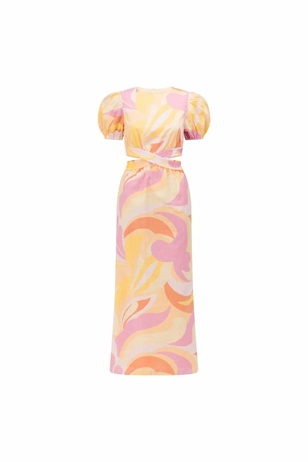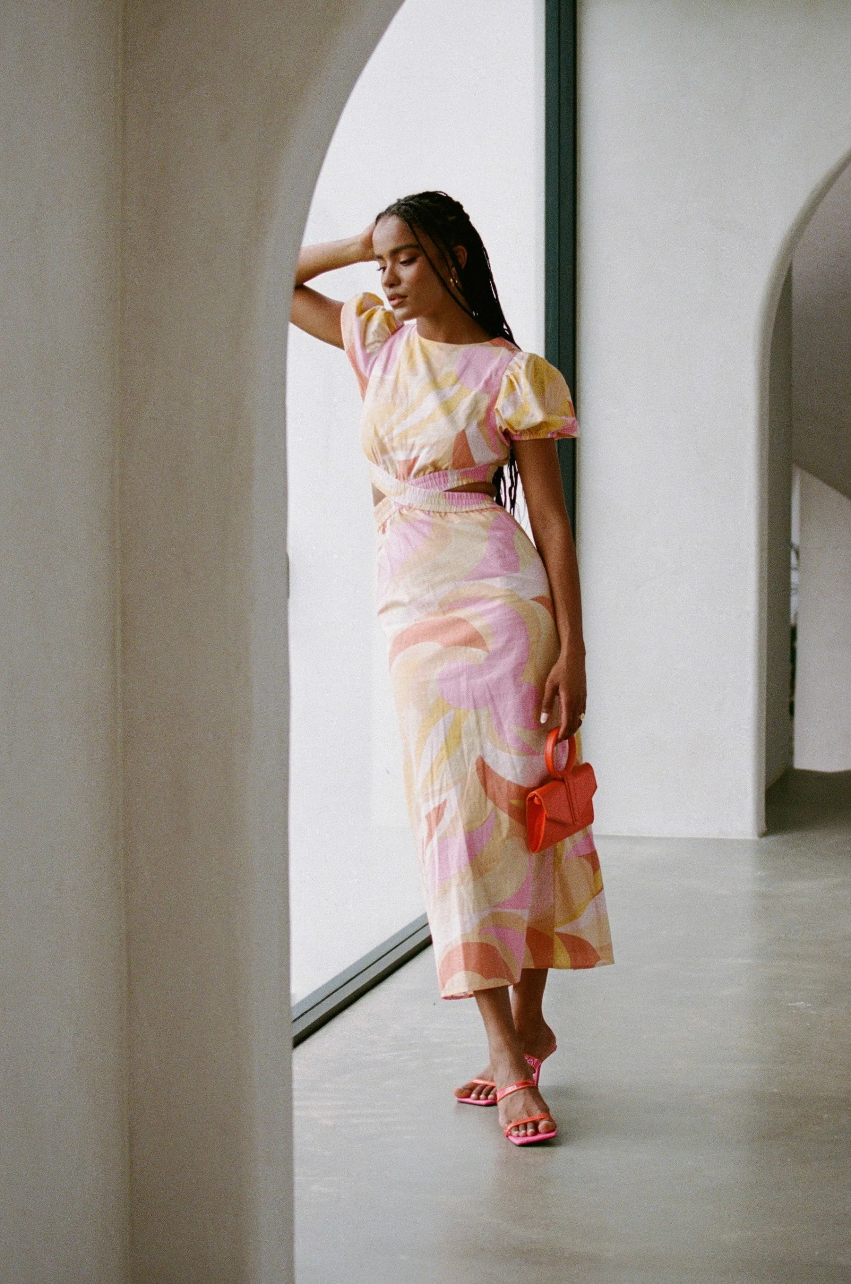 Introducing our brand new print that screams summer – Lucid Fuego. The Khaan Midi Dress is made from a high quality natural cotton fabric. It features a high rounded neckline, short puff sleeves, cutouts at waist, with cross over elastic details and a midi skirt with centre back split. Pair with the Zita Strappy Sandals for a cute day-to-night look! Designed exclusively by Sabo.