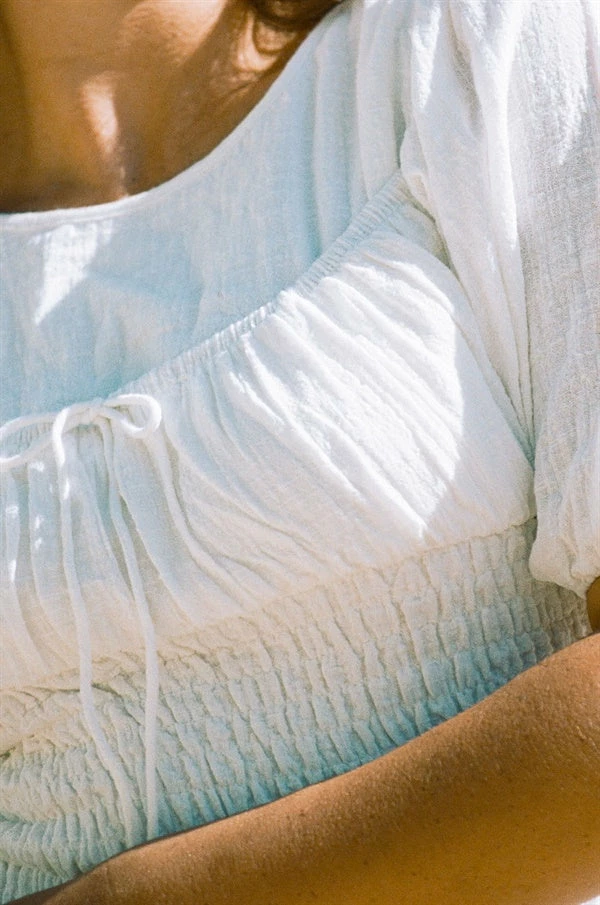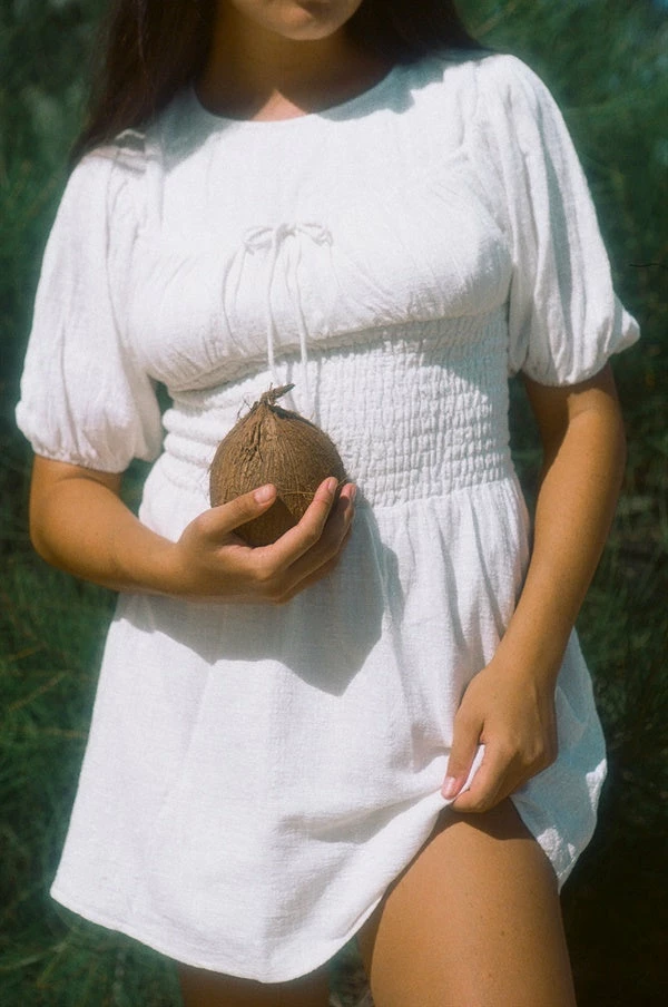 Let us do the layering for you! The Kiah Dress is made from a natural cotton fabric in an off white hue. It features short puff sleeves, high rounded neckline, elastic detailing across waist and a flouncy skirt. Keep it casual with sandals and the T Bar Pearl Necklace! Designed exclusively by Sabo.