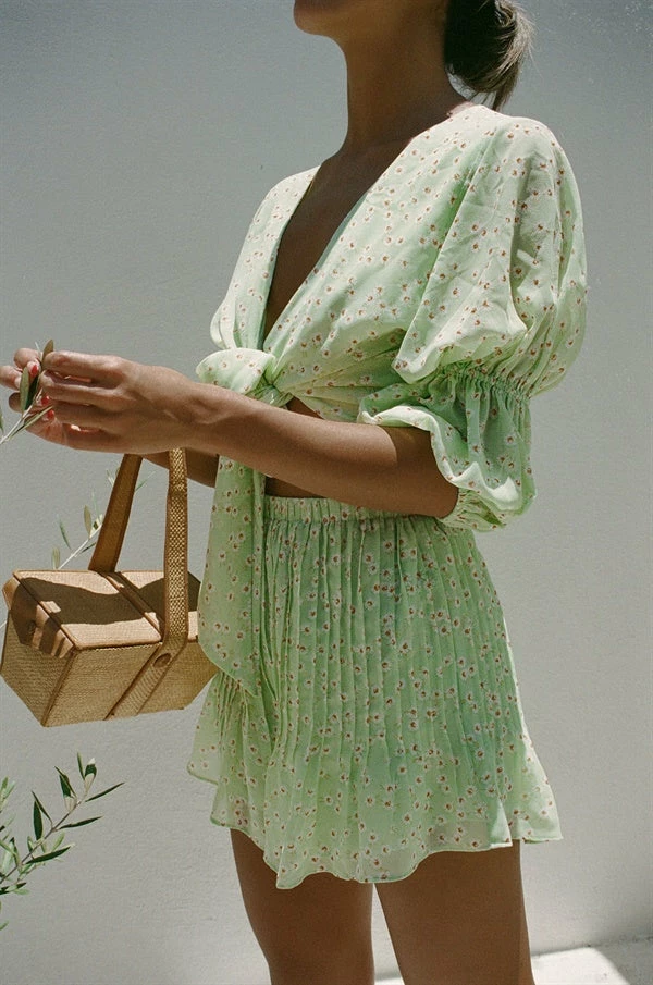 *THIS IS A FINAL SALE ITEM* Perfect for summer, the Kierra Shorts are made from a fresh green lightweight fabric with our exclusive hand painted daisy print throughout. They are a high waisted style featuring an elasticated waist, pintuck detailing across waist and a flouncy high-low hem. Complete the look with the Kierra Top, Mini Toffee Claw Clip and 18K Radiance Necklace. Exclusively designed by Sabo.