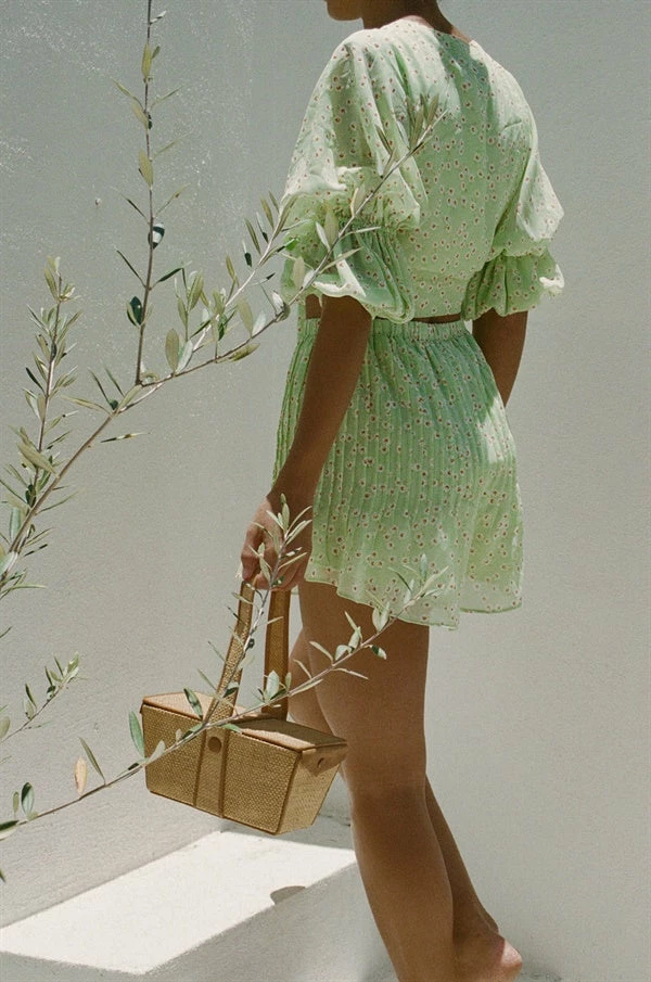 *THIS IS A FINAL SALE ITEM* Wear it as a set or keep it casual and pair it with denim! The Kierra Top is made from a fresh green lightweight fabric with our exclusive hand painted daisy print throughout. It features a plunging neckline with tie at waist and puff sleeves. Get the look with the Kierra Shorts, Weave Handle Tote Bag and 18K Radiance Necklace. Exclusively designed by Sabo.