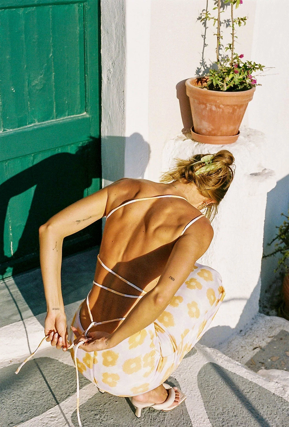 Lunch with the girls or an upcoming event, the Kika Dress is designed to flatter! Made from a stunning slinky fabric with our exclusive smudge floral print, this midi style features an open back with strappy detailing, asymmtric neckline and cutouts at waist. Get the look with the Strappy Asteria Heels! Designed exclusively by Sabo.