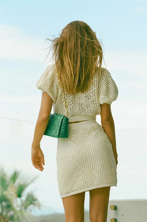 The vintage inspired Kimmi Knit Skirt is made from a stunning diamond knitted cotton fabric in a cream hue. It is a high waisted style featuring an elasticated waist. Complete the look with the Kimmi Knit Top and Jolie Chain Bag! Designed exclusively by Sabo.