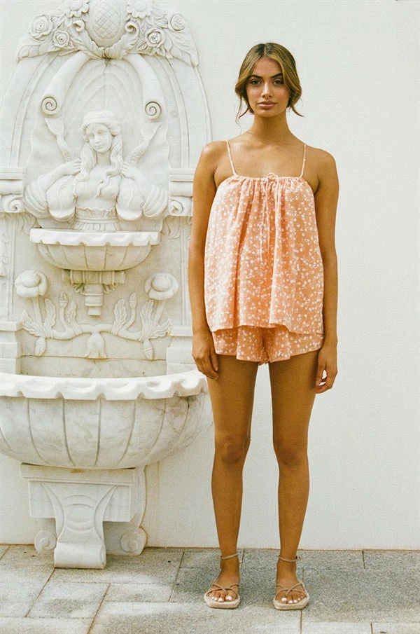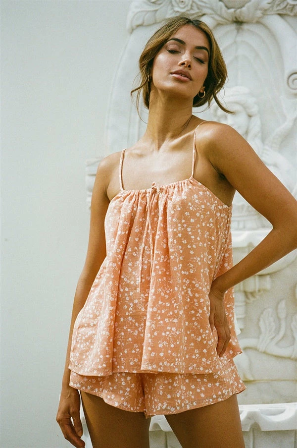 A feminine design in the most luscious fabric! The Kimora Top is made from a raw natural cotton cheesecloth fabric in an orange hue. It features our exclusive ditzy floral print, thin straps with a draw tie at neck and flouncy fit. Get the look with the Kimora Shorts! Designed exclusively by Sabo.