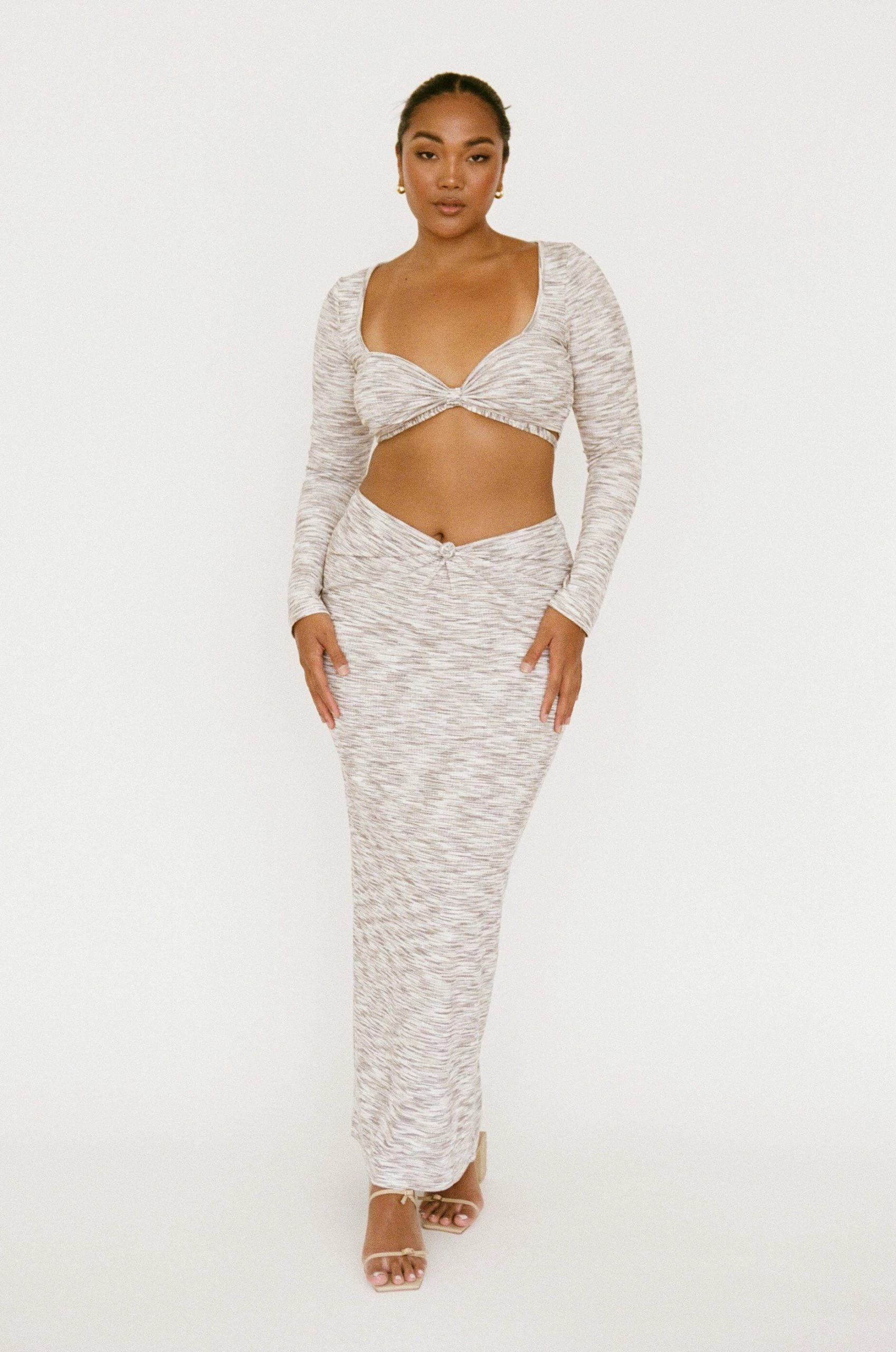 Dress it up and wear it as a set or pair it back with denim! The Kirri Halter Top is made from a ribbed fabric in a marl grey white and tan hue. It features full length fitted sleeves, twist at centre bust and tie detail. Styling tip: tie can be worn around waist or neck! Designed exclusively by Sabo.