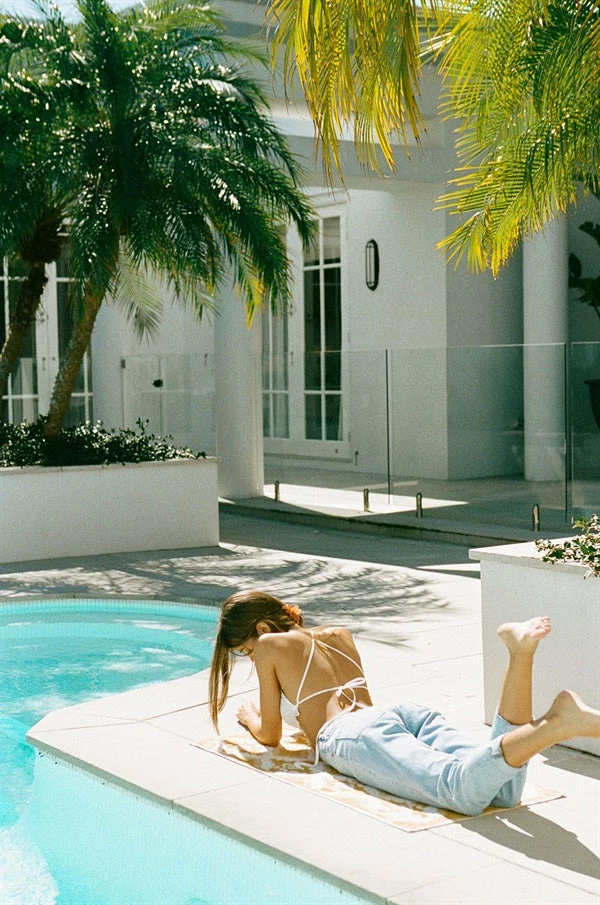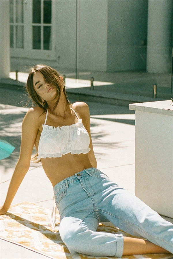 The perfect pair for your jeans! The Kleo Top is made from a natural cotton broiderie anglaise fabric in an off white hue. It is a backless bandeau style featuring ruffle trims and thin straps. Exclusively designed by Sabo.
