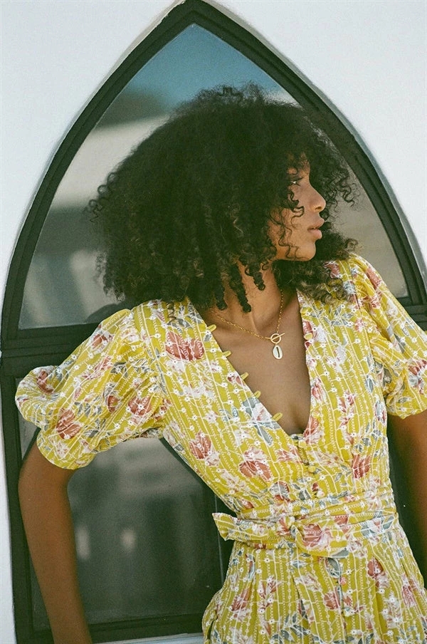Our best selling Kori Dress now comes in a bold new print! Made from a mustard floral fabric, this style features contrast embroidery, a plunging V neckline with covered button detailing down centre front and sides of skirt, short puff sleeves and a matching waist tie. Get the look with the Strappy Rafaela Heels and gold accessories! Designed exclusively by Sabo.