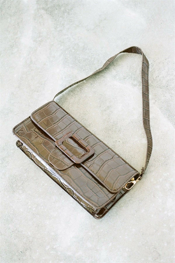 Accessorise your outfit with the Kumi Bag, made from a vegan croc skin in a brown hue. It features a flap closure with buckle detailing and short matching strap.