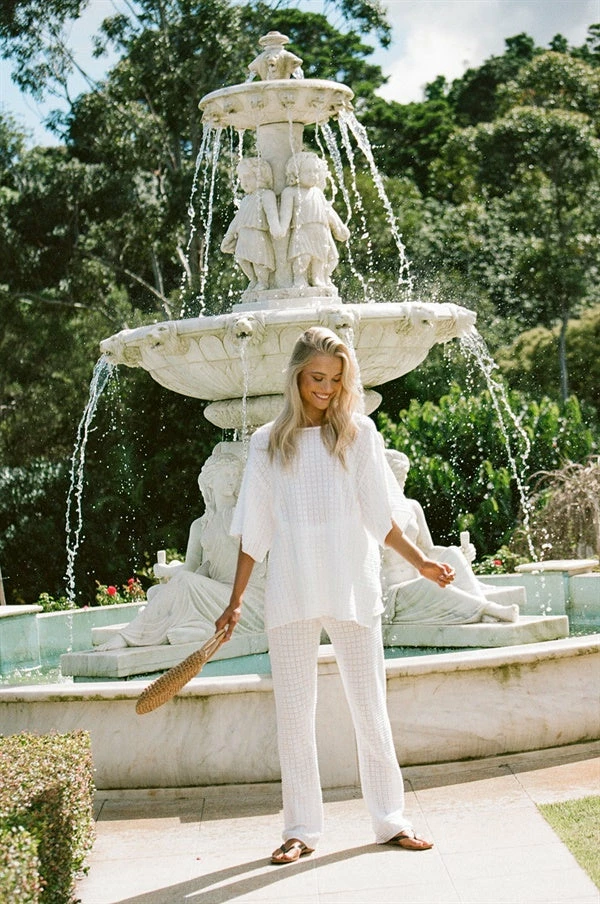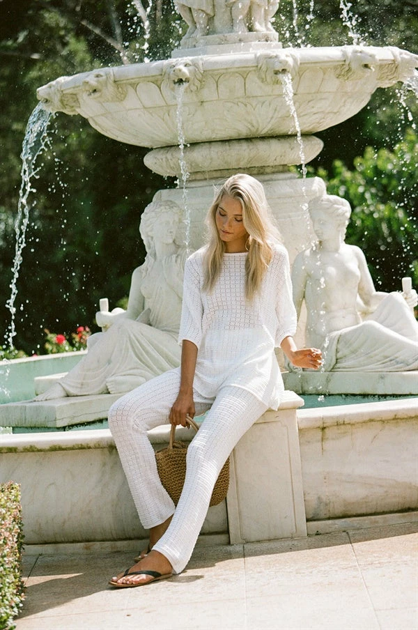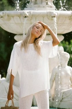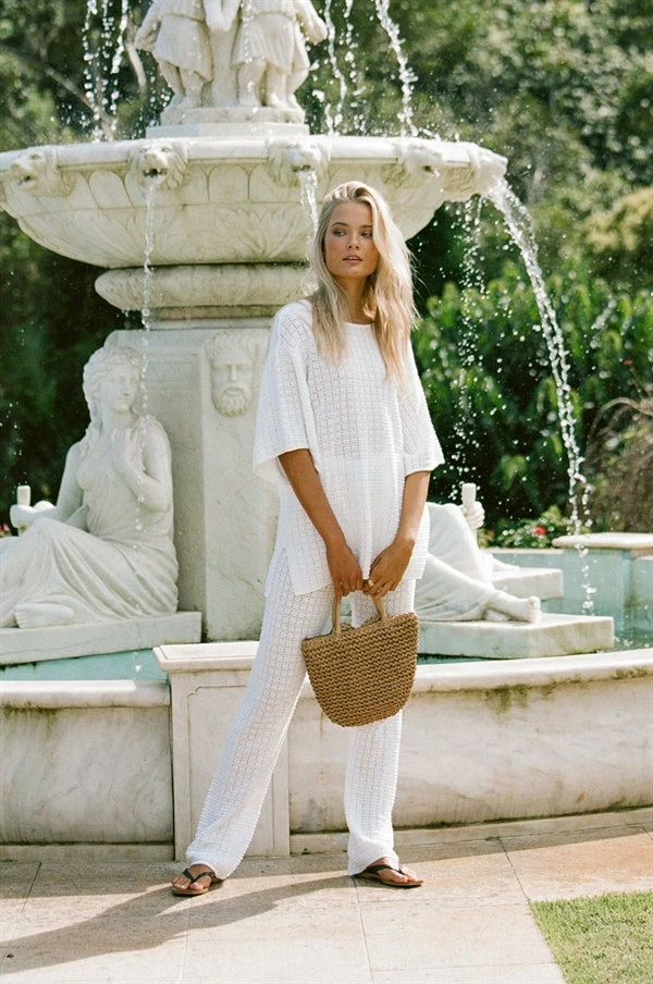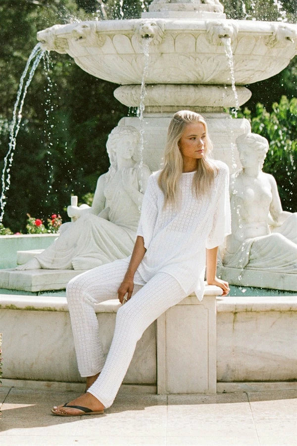 The super chic Lait Knit Top is made from a high quality loose knit cotton with a textured feel and square design. It is a boxy style featuring short relaxed sleeves, rounded neckline, splits at sides and rolled hem. Get the look with the Lait Knit Pants and Gold Cross Necklace! Exclusively designed by Sabo.