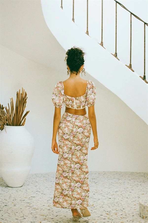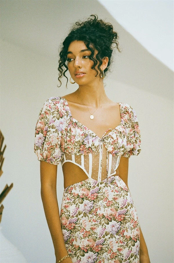 The dreamy Leah Corset Maxi is made from a lightweight chiffon-feel fabric with a floral print. It is a maxi style featuring short puff sleeves, elasticated neckline with tie at centre bust, gathered cups, a sheer boned corset detail and cutout at waist. The perfect outfit for your next event! Designed exclusively by Sabo.