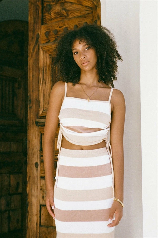 *BACK IN STOCK* Wear it as a set or style it your way! The Leti Top is made from a natural knitted cotton fabric with white, beige and tan stripes throughout. It features a straight neckline, thin straps and adjustable draw detailing at sides. Complete the look with the Leti Skirt and Oak Sandals! Exclusively designed by Sabo.