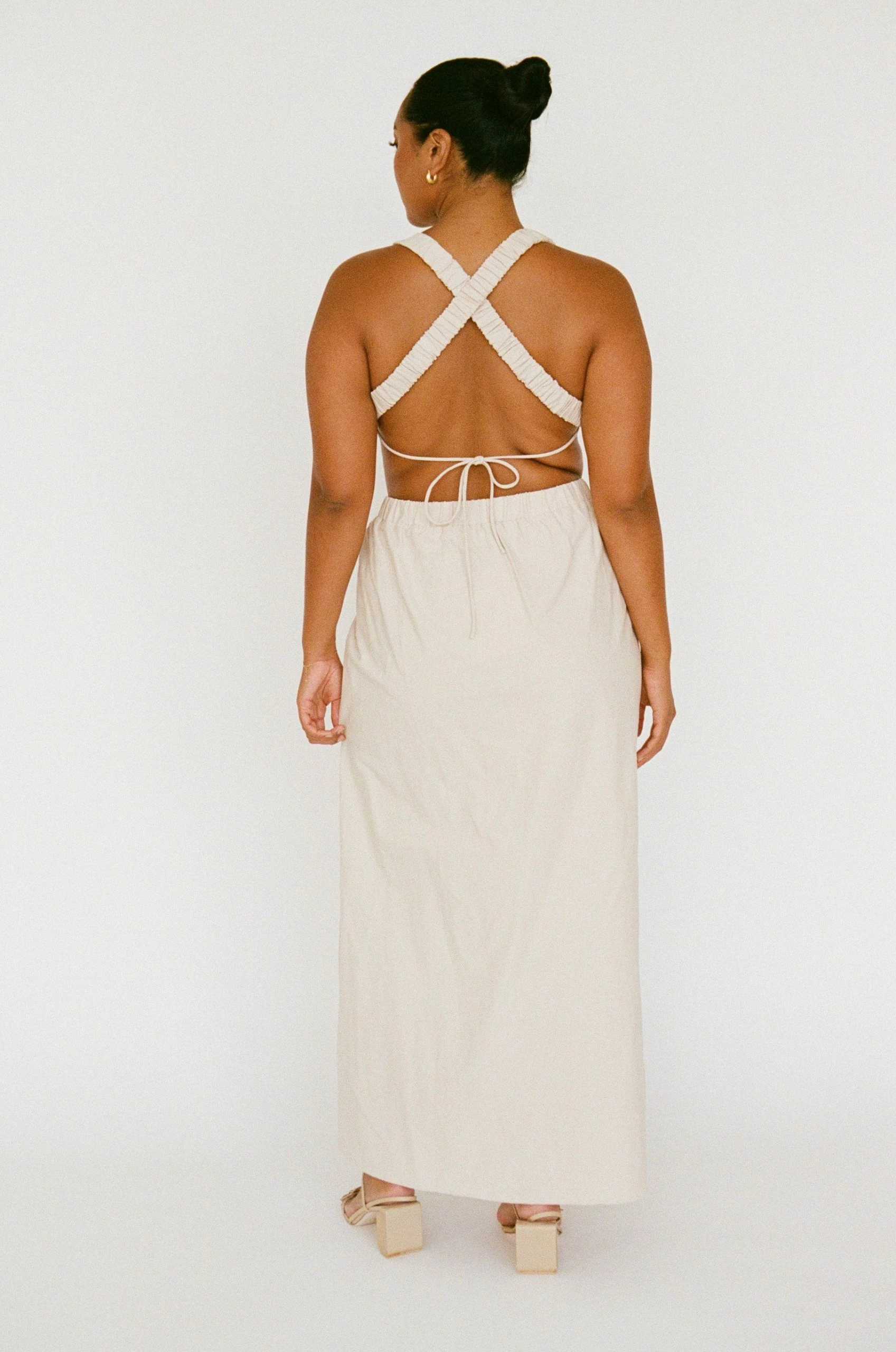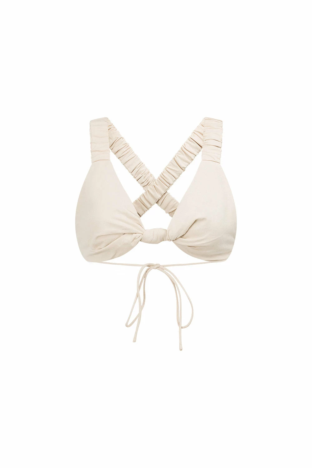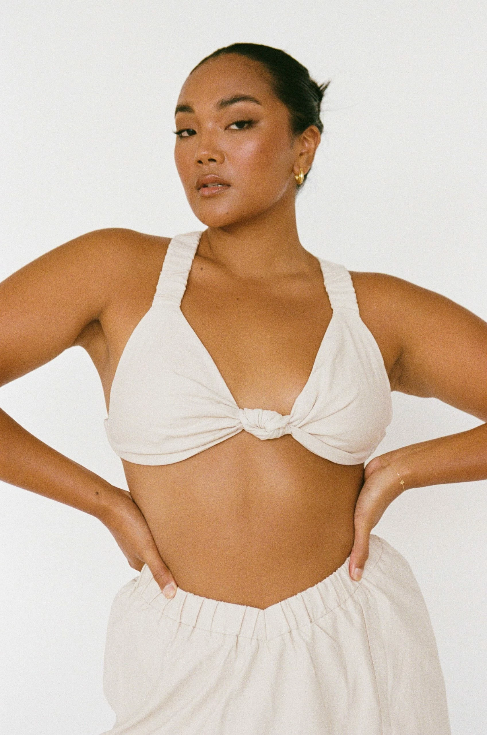 Wear it as a set or use it as a styling layering piece! The Levana Top is made from a high quality natural cotton fabric in a cream hue. It is a bra style and features a twist detail at centre bust, elastic cross over straps and thin rouleau tie at back. Get the set with the Levana Midi Skirt or layer with an oversized shirt! Designed exclusively by Sabo.
