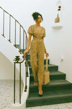 We’ve got your festive season sorted! The Lexii Jumpsuit is made from a chiffon-feel fabric in a tan hue with a floral print. It features full length wide leg pants, cutout at waist, V neckline with covered buttons and short puff sleeves. Complete the look with the Micro Beaded Bag and Anastasia Sunglasses! Designed exclusively by Sabo.