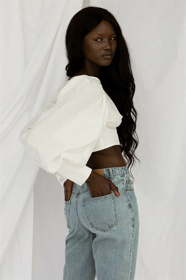 Designed to flatter, the Linen Calista Top is made from a high quality linen blend fabric in an off white hue. It features a fitted corset style waist, full length puff sleeves with tight cuffs and a wide rounded neckline. Pair with high waisted structured shorts and Oro Ruched Baguette Bag for your next night out! Exclusively designed by Sabo.