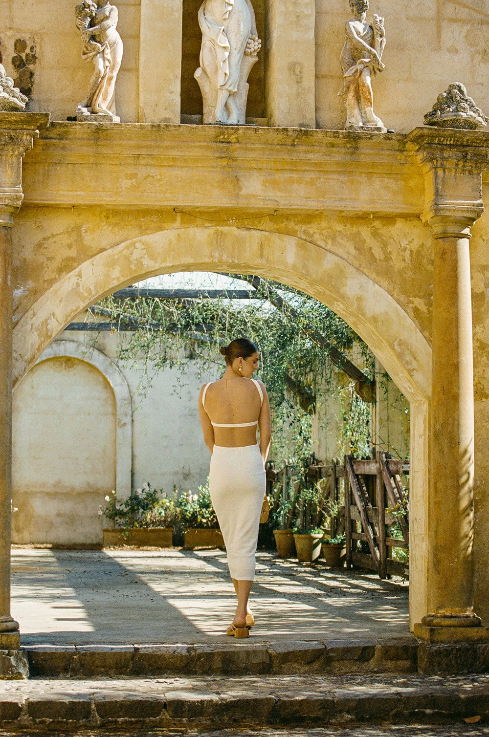 Wear it to dinner with the girls or on date night! The London Knit Dress is made from a ribbed fabric in a soft cream hue. It is a backless style featuring a scoop neckline, midi length and cutouts at waist. Pair with the Rico Handle Bag and and Strappy Lilly Heels! Designed exclusively by Sabo.