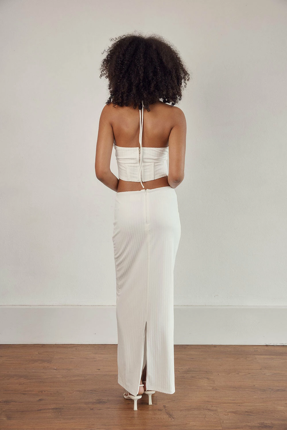 A simple skirt that can be dressed up as a set or styled your way paired back with a casual top! The Lori Midi Skirt is made from a luxurious white fabric with a self stripe throughout. It is a high waisted style featuring a form fitting skirt with centre back split. Get the look with the Lori Halter Top and Strappy Rafaela Heels! Designed exclusively by Sabo.