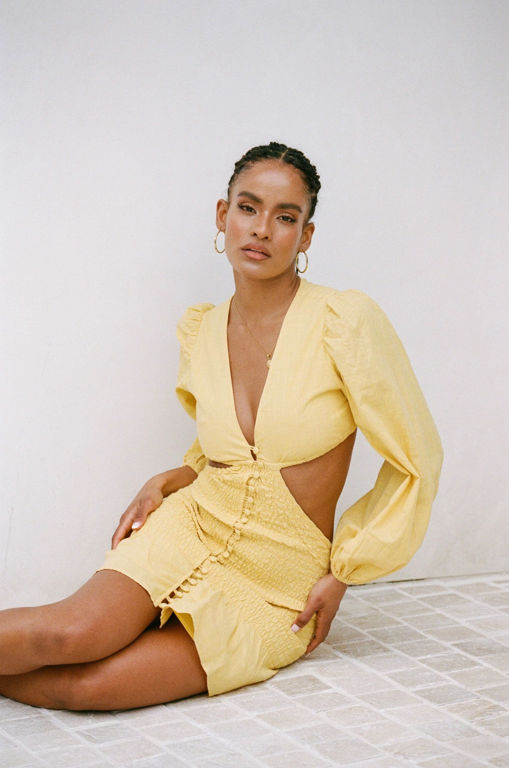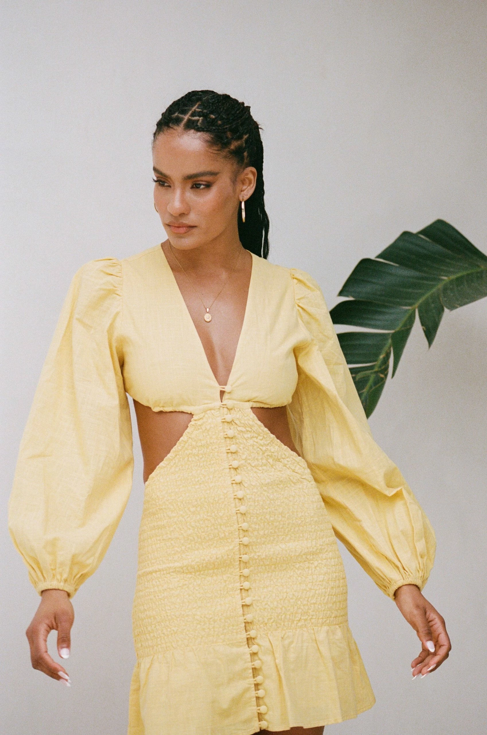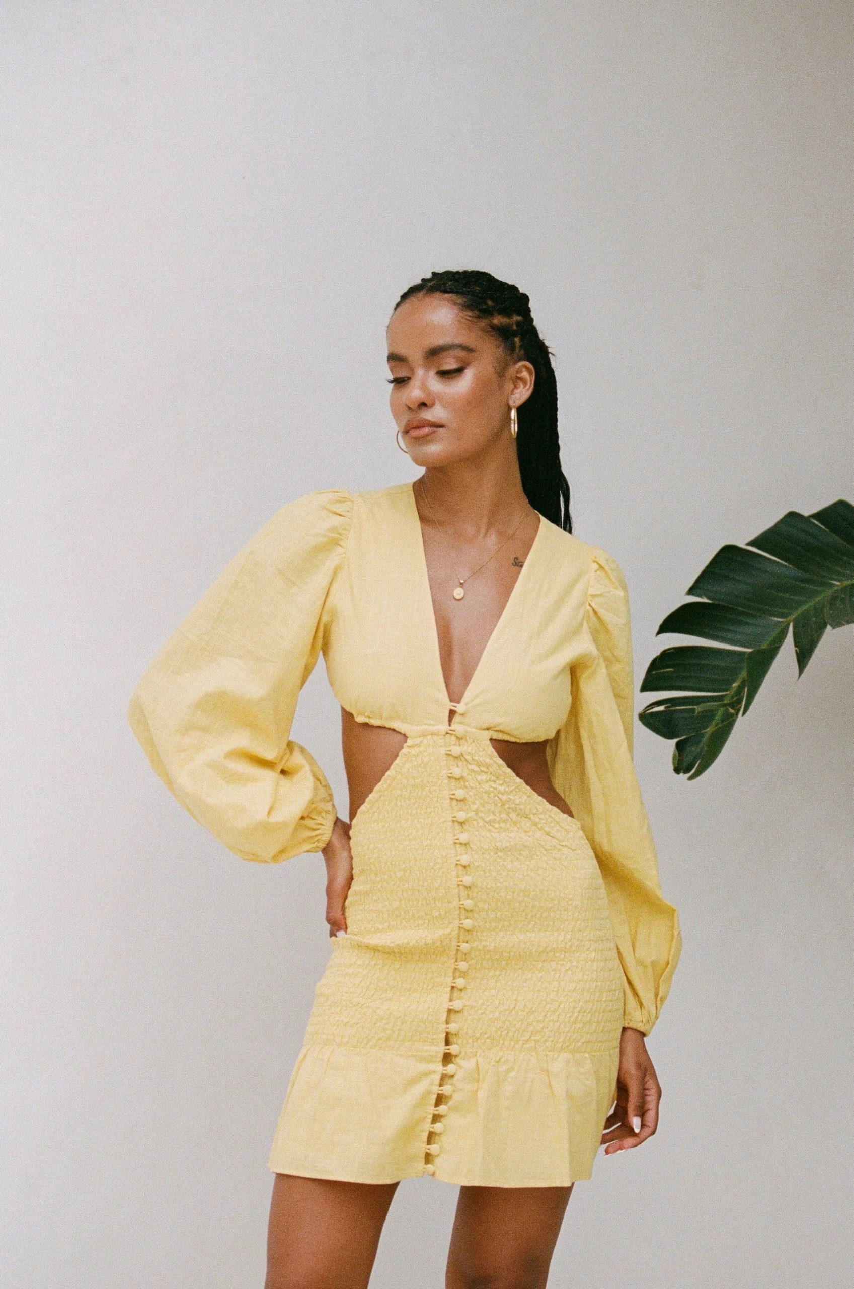 Stand out in our flirty Luda Cutout Dress, made from a structured natural cotton fabric in a yellow hue. It features full length billowing sleeves, plunging V neckline, shirred body, covered buttons down centre front and a frill across hem. Dress it up with the Jamilla Bag and Strappy Rafaela Heels! Designed exclusively by Sabo.