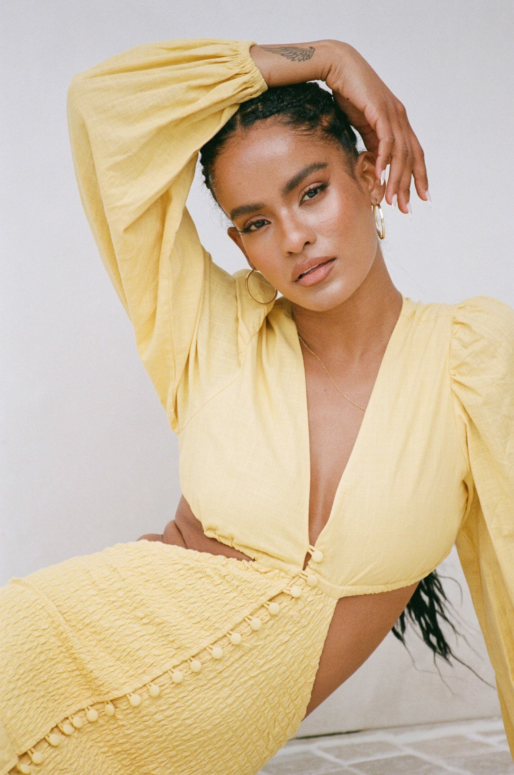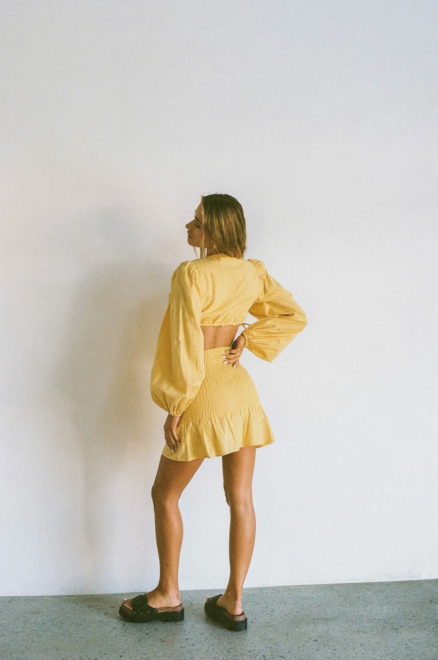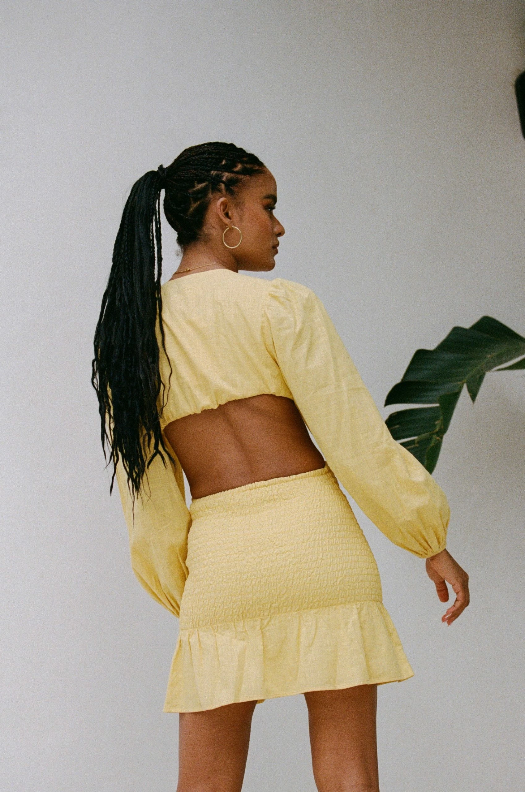 Stand out in our flirty Luda Cutout Dress, made from a structured natural cotton fabric in a yellow hue. It features full length billowing sleeves, plunging V neckline, shirred body, covered buttons down centre front and a frill across hem. Dress it up with the Jamilla Bag and Strappy Rafaela Heels! Designed exclusively by Sabo.