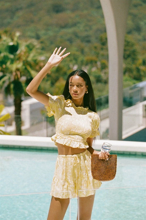 The perfect blend of feminine and structure! The Mahli Top is made from a linen blend fabric with our exclusive ditzy speckled floral print. It is a cropped style featuring a flattering shirred body, short puff sleeves, frill detailing at cuffs and hem and a rounded neck with a ruffle trim. Get the set and pair with the Mahli Shorts! Designed exclusively by Sabo.