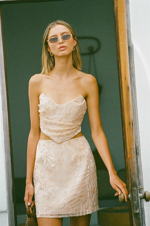 We’ve got your party outfit sorted! The Mardi Mini Skirt is made from our exclusive burnout fabric in a tan hue. It is a high waisted style featuring a body skimming fit and pairs perfectly with the Mardi Drape Top! Designed exclusively by Sabo.