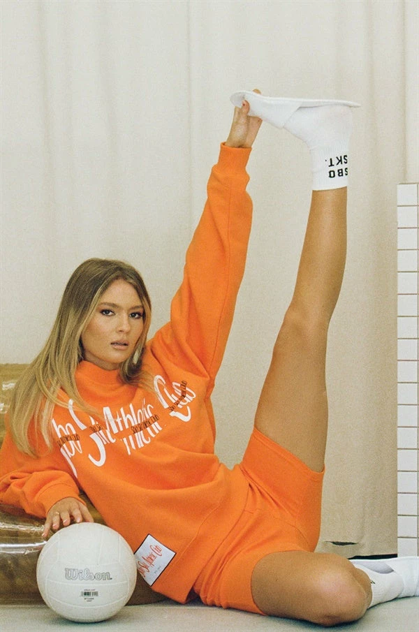 Vintage vibes and neutral tones! The Medley Sweater is made from a natural cotton terryback sweater fabric in a vibrant orange hue. It is an oversized style featuring a crew neck, relaxed full length sleeves, ribbed trims throughout and SBO SKT Athletic Club printed detailing at chest. Pair with the Medley Bike Shorts! Designed exclusively by Sabo.