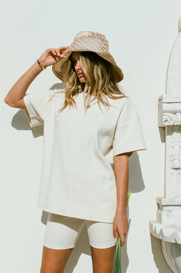 *THIS IS A FINAL SALE ITEM* A super comfy basic in an easy-to-wear hue! The Mellow Tee is made from a ribbed cotton fabric in a cream hue and features short sleeves and a high rounded neckline. Complete the look with the Mellow Legging Shorts, fresh sneakers and Satchel Backpack and 18K Wonderlust Necklace! By Sabo Skirt.