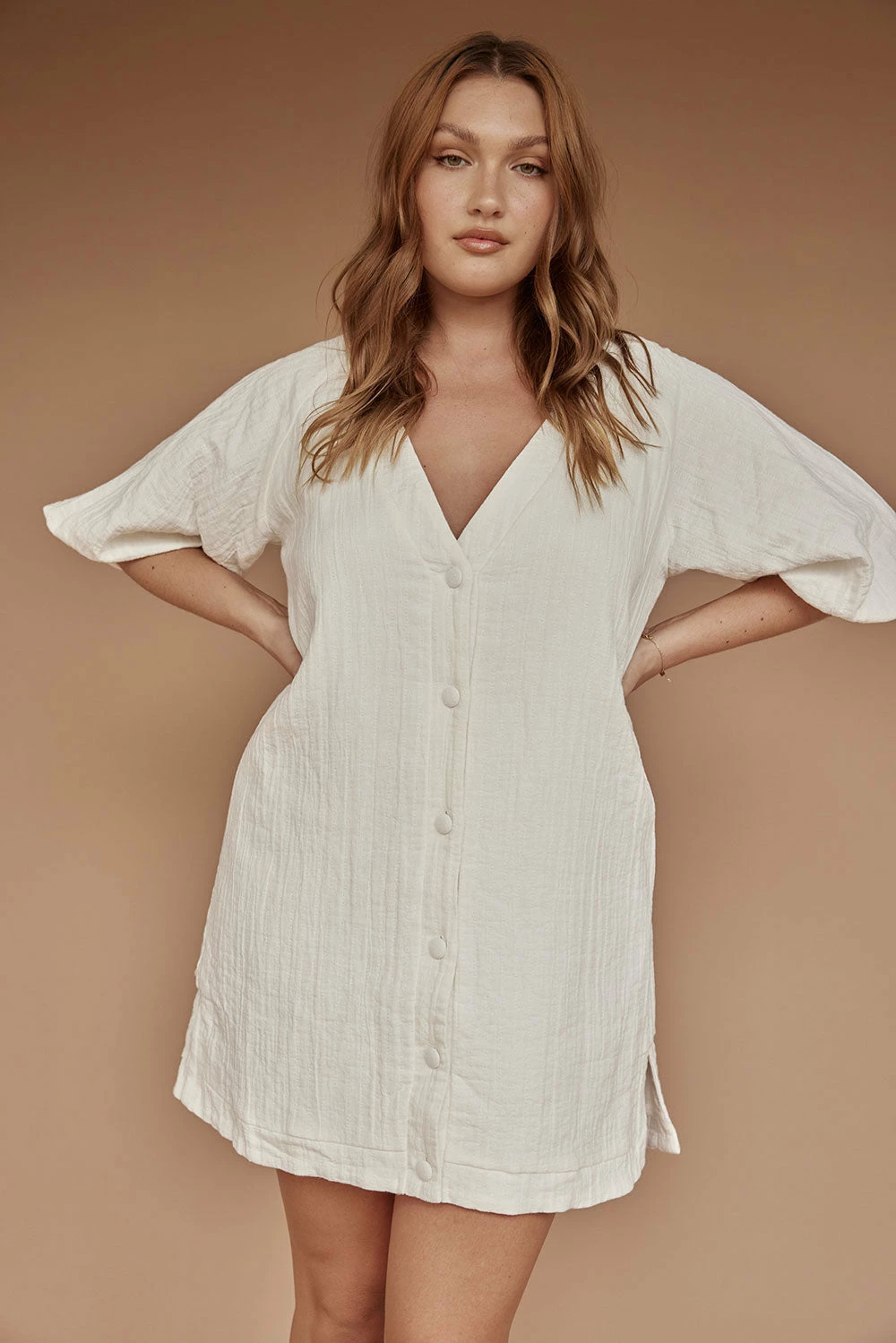 A super chic easy-to-wear throw on piece, the Mikallo Dress is made from a thick textured cotton fabric in white and features 1/2 length puff sleeves, plunging V neckline, splits at sides and buttons down centre front. Styling tip: For a more relaxed look, size up! Designed exclusively by Sabo.
