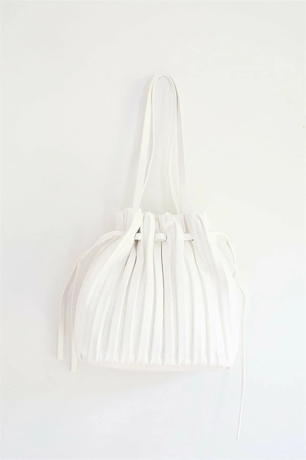 The super cute Nadia Pleated Bag is made from an off white vegan leather and features twin handles and draw ties at top.