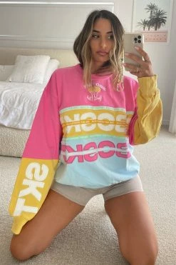 Everyone’s favourite sweater has had a makeover! The Nakia Sweater designed to be super oversized and is made from a natural terry back cotton fabric in pink, yellow and blue hues. It is a relaxed style featuring a crew neckline, super slouchy full length sleeves and embroidered and tape panel detailing throughout. Pair with the Taffy Bike Shorts and sneakers! Designed exclusively by Sabo.