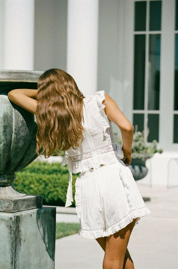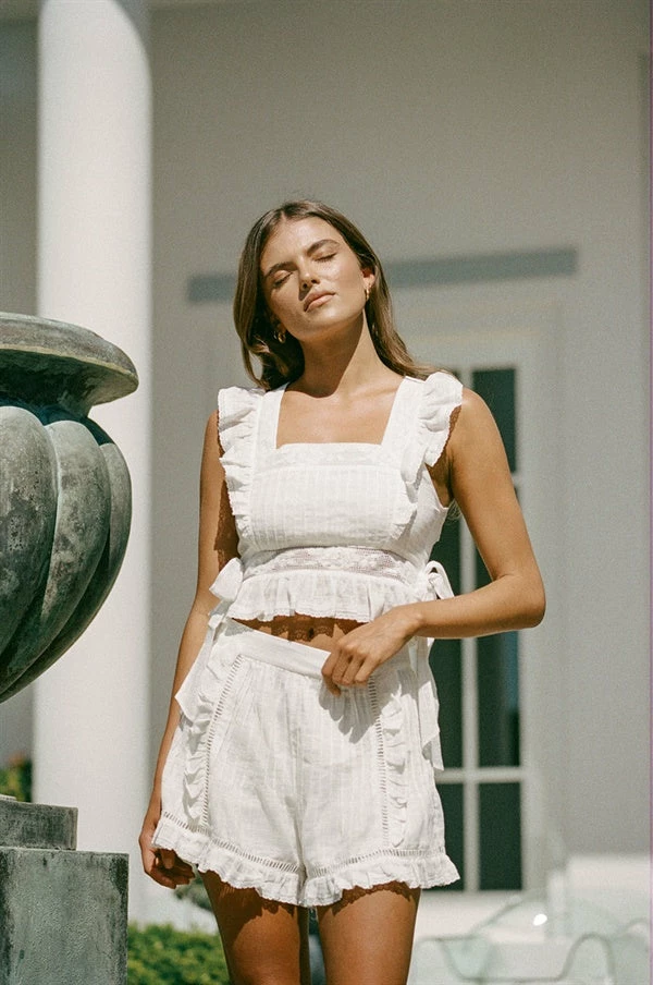 A staff HQ favourite! The Nieve Shorts are made from a high quality natural cotton cheesecloth fabric in an off white hue. They are a high waisted style featuring pintucks, high-low hems and lace, ladder and frill detailing throughout. Complete the look with the Nieve Top! Designed exclusively by Sabo.