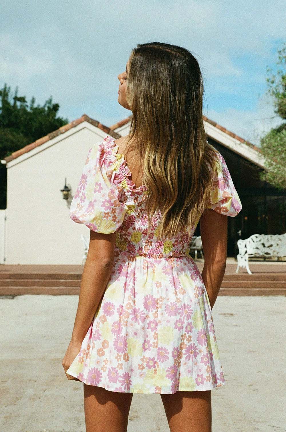 Feminine florals, flounce and bright hues! The Nikita Dress is made from a natural cotton voile fabric with our exclusive marker floral print. It features short puff sleeves, ruffle across neckline, draw tie detail at centre bust, fitted shirred waist and flouncy skirt. The perfect piece to wear to a lunch! Designed exclusively by Sabo.
