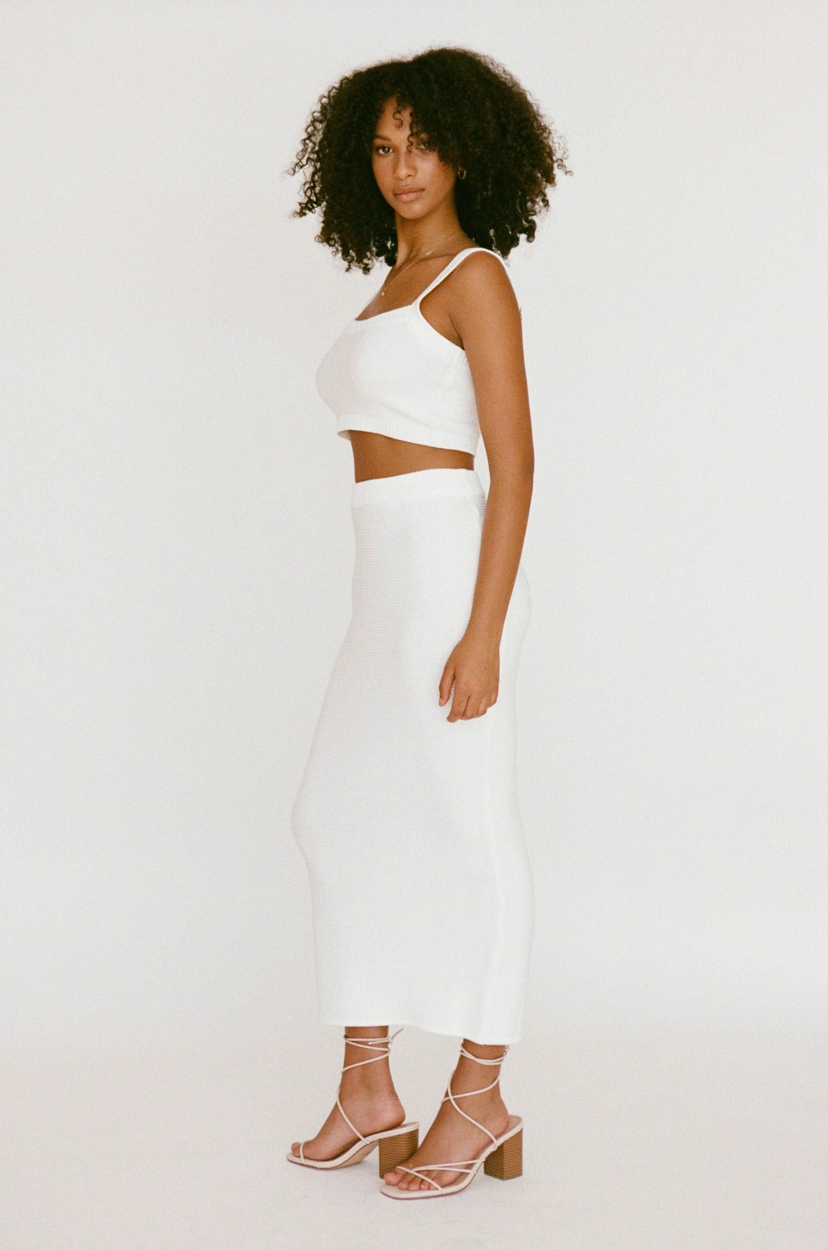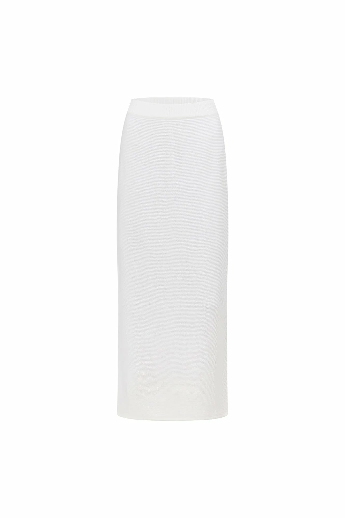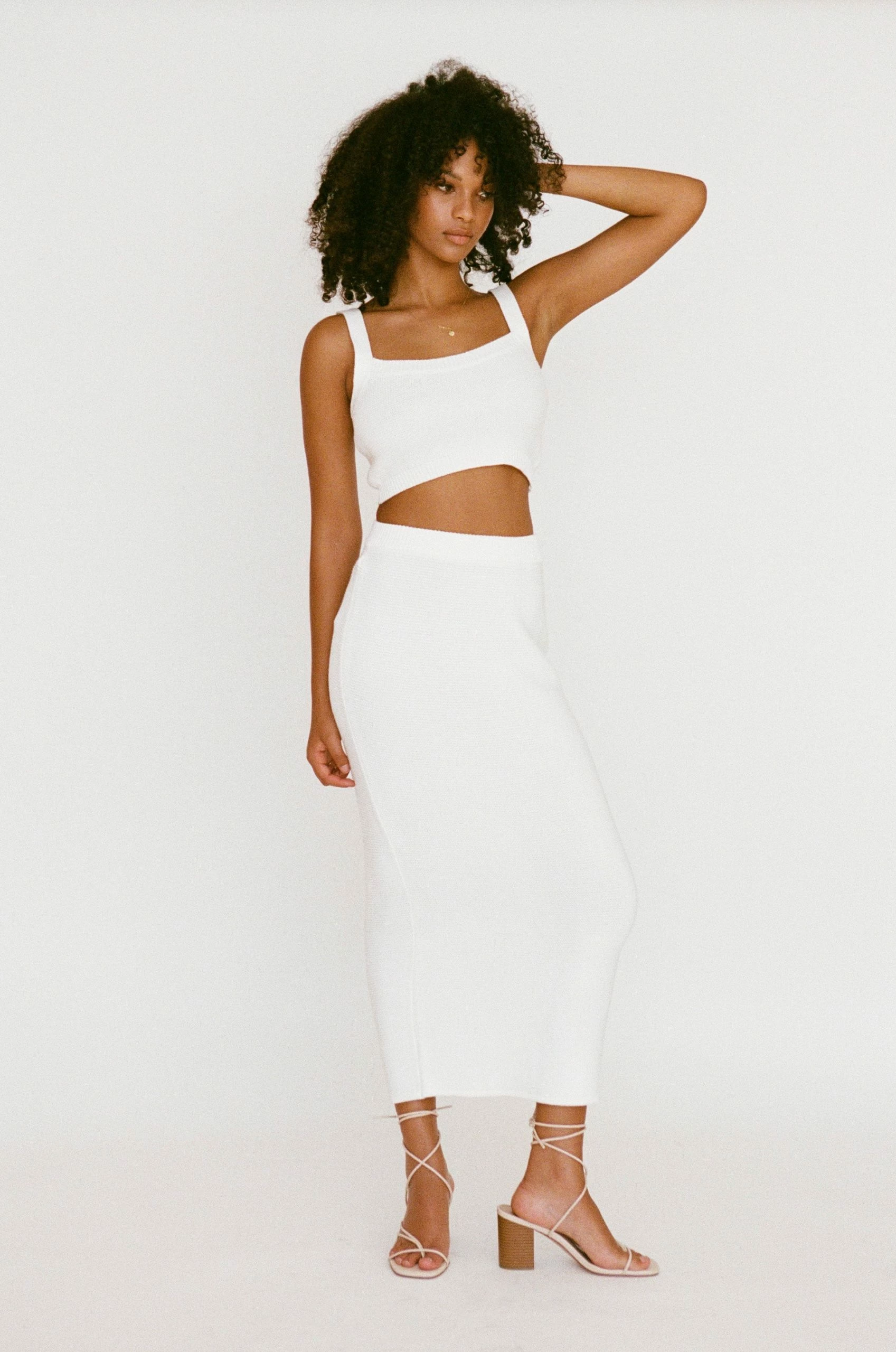 A basic must-have! The Nooa Skirt is made from a cotton blend knit fabric in an off white hue. It features an elasticated ribbed waist and midi length. Get the set with the Nooa Top! Designed exclusively by Sabo.